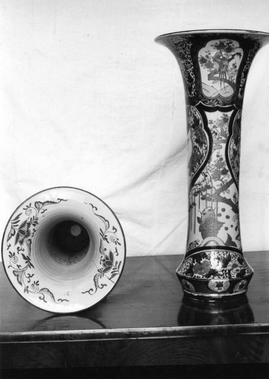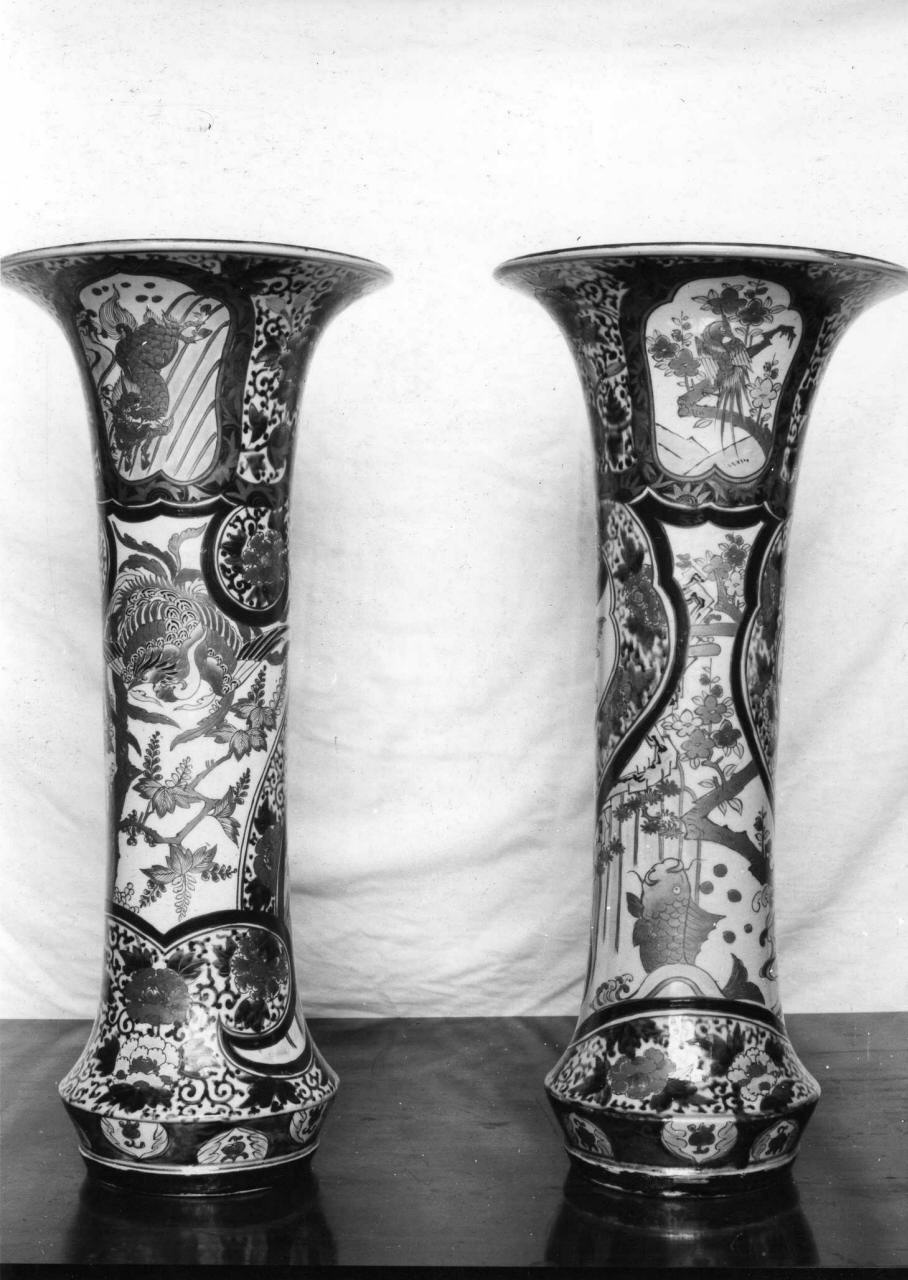 Vasi a forma di tromba in porcellana del Giappone; sono ornati di due medaglioni raffiguranti paesaggi orientali e di rami con fiori e foglie arancio e blu su fondo oro; sul collo, piccoli paesaggi entro cartiglio, su fondo blu con foglie oro. Sono bucati sul fondo e facevano parte di un torcere composto di 4 vasi sovrapposti