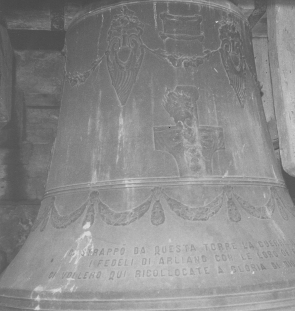 - ISCRIZIONI su un lato - CI STRAPPO' DA QUESTA TORRE LA GUERRA IL 1943 / I FEDELI DI ARLIANO CON LE LORO OFFERTE / CI VOLLERO QUI RICOLLOCATE A GLORIA DI DIO IL 12-7-1946 -