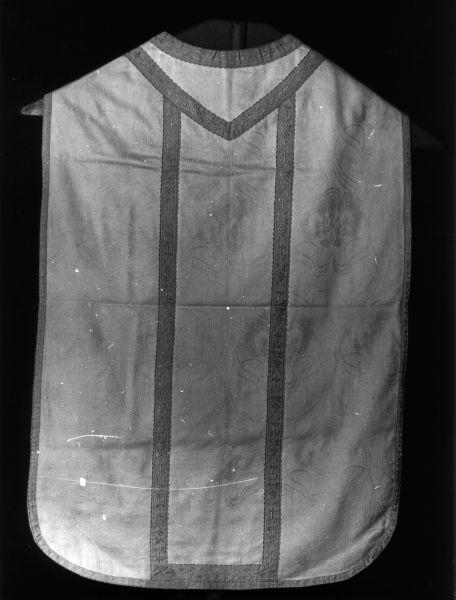 Pianeta bianca. Cotone al telaio meccanico. Il disegno del tessuto si evidenzia tono su tono per effetto liserè. Ha un'impostazionea teorie di maglie disposte a scacchiera. Al centro si trova un fiore-frutto fantastico con foglie fiammate, elementi lobati simmetrici; in alto è sormontatoda un piccolo medaglione. Dalla base invece si dipartono specularmente verso destra e sinistra e poi in alto e in basso delle linee ondulate, decorate in stile liberty che collegano tra loro i fiori-frutto. La fodera è in tela di lino giallo. I galloni, in filato sintetico giallo e decorazione a croce e grappoli d'uva, misurano 3,4 negli stoloni e 1,4 nei profili