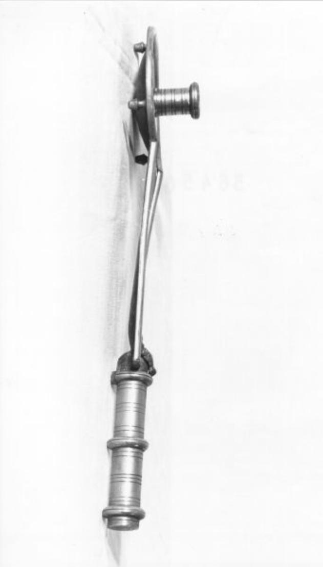 La decorazione, assai semplice, che si ripete sull'impugnatura e nel corpo è costituita da tre orbite rilevate pausate da profilature. All'attacco del manico con l'impugnatura una piccola foglia d'acanto