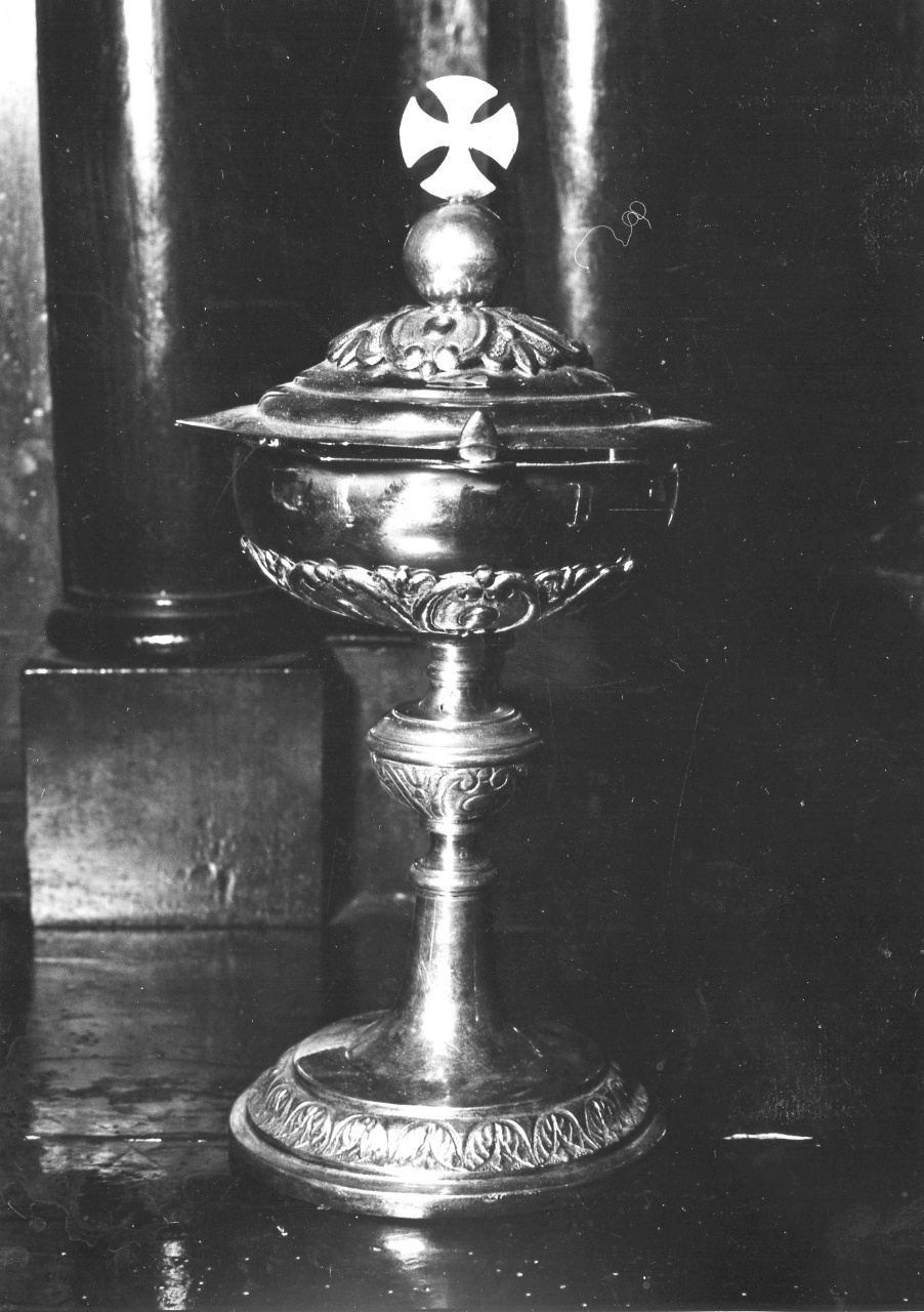 Pissside d'argento, sormontata da crocetta apicale, con decorazione a rilievo di volute e cartigli, con ampia base circolare. Il coperchio e la coppa hanno bordi di forma esagonali