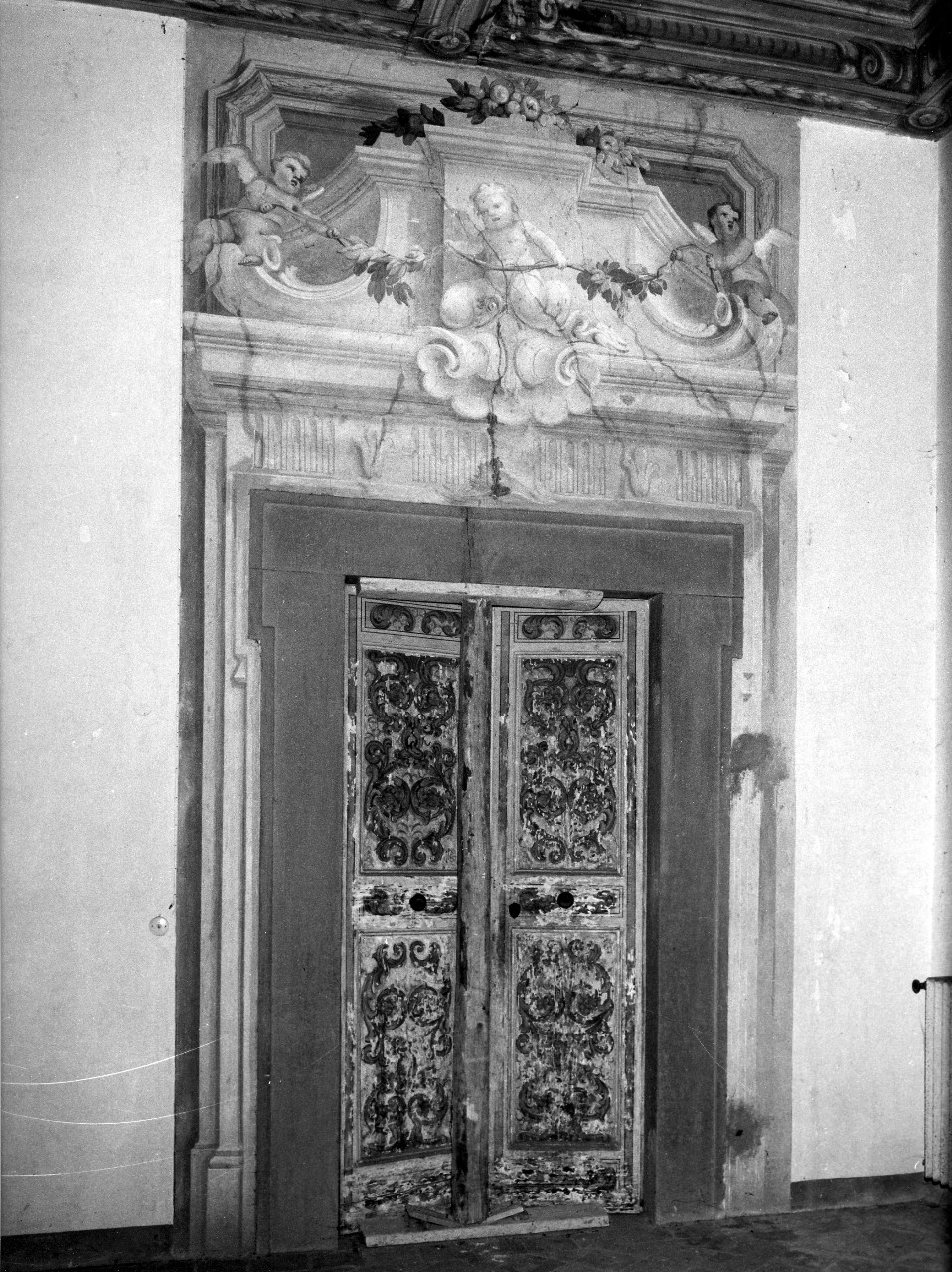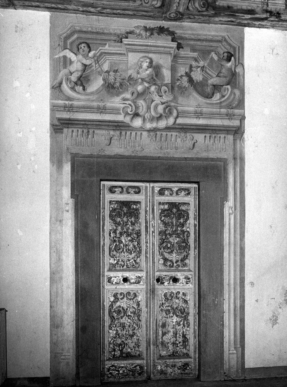 Soggetti profani. Figure: amorini; tritone. Elementi architettonici: cornicione. Decorazioni: riccioli; festoni di foglie; valva di conchiglia