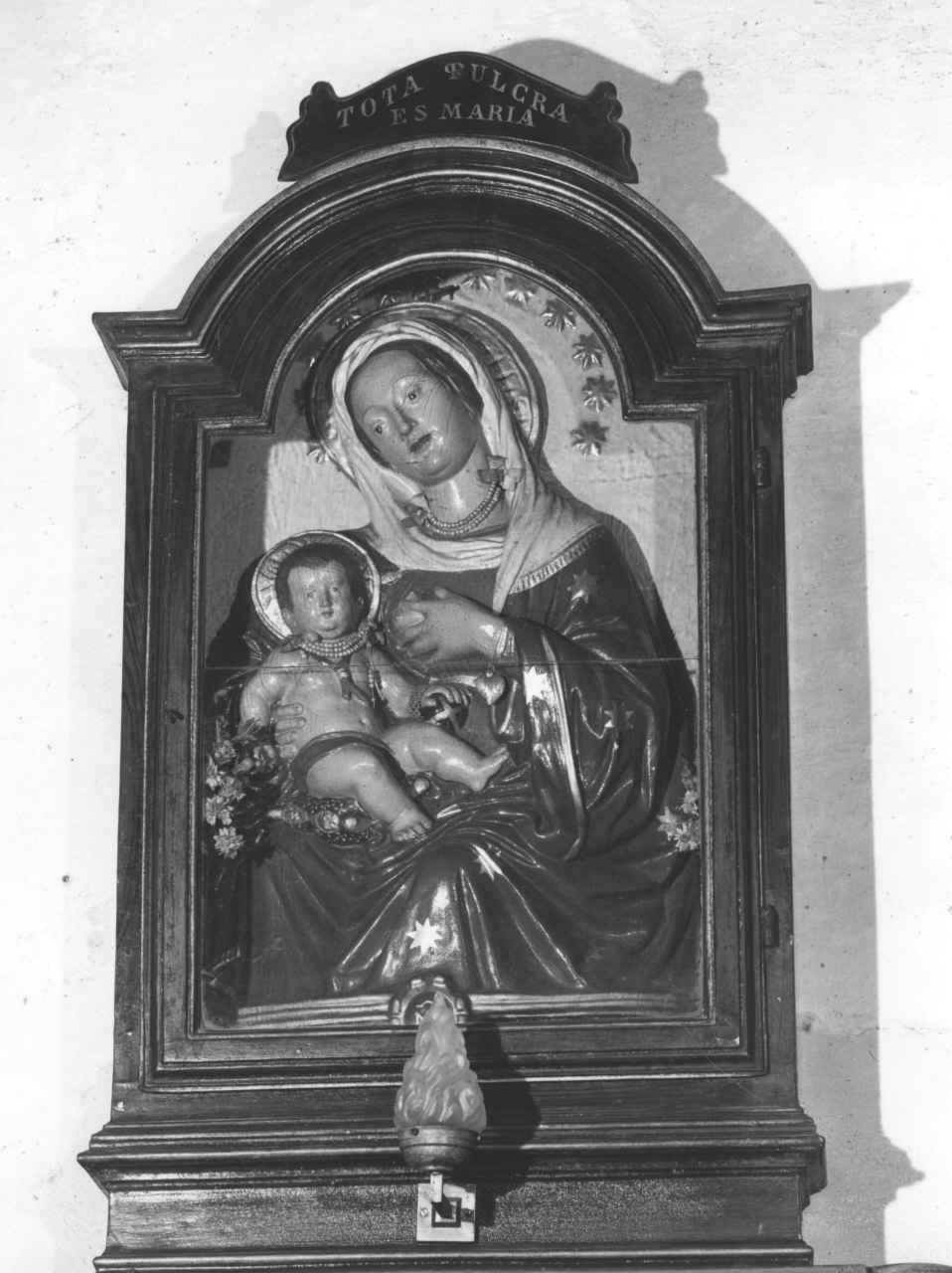 La scultura è contenuta in una edicola in legno dipinto e parzialmente dorato, sovrastata da cartiglio