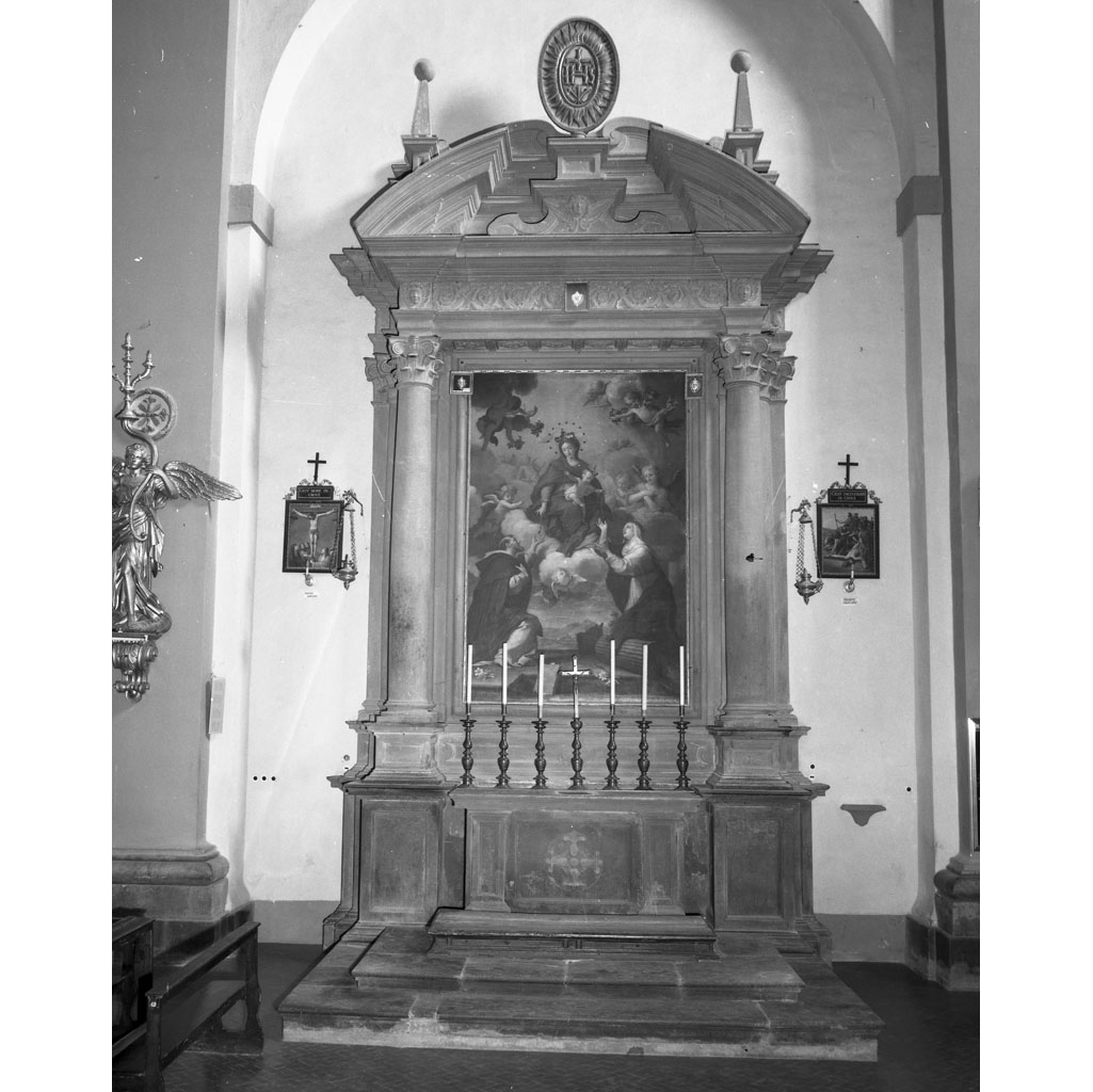 Altare su pietra della cappella del Rosario, con tela di A. Franchi raffigurante la Madonna che offre il Rosario a santa Caterina e a san Domenico. Due colonne sostengono un frontone spezzato con il monogramma di Cristo al centro