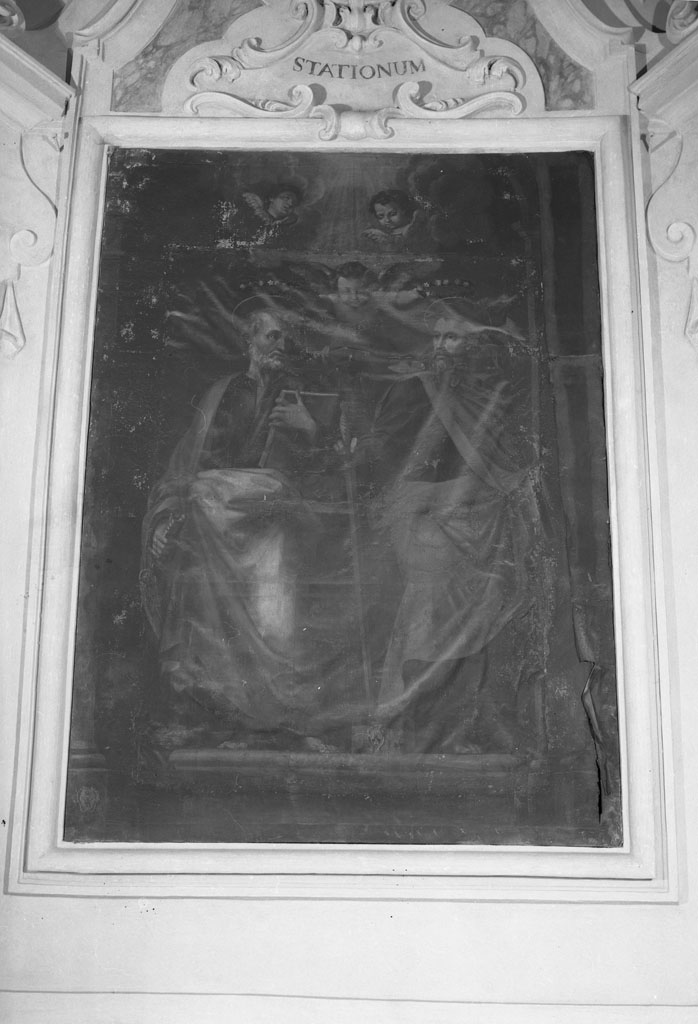 - NOTIZIE STORICO CRITICHE Questa tela, eseguita da Orazio Porta, è molto vicina ad una cultura raffaellesca da questo allievo vasariano attraverso una visione diretta delle opere di Raffaello a Roma. Per confronti stilistici fra la nostra tela e quella di ambiente raffaellesco, si vedano le due opere gemelle con il s. Pietro ed il s. Paolo eseguite da Raffaello Lauzio e aiuti e oggi conservati negli appartamenti vaticani di cui i nostri apostoli sono una precisa derivazione. Pervenuto a noi in cattive condizioni il dipinto, della fine del XVI secolo, mostra le tracce evidenti di varie aggiunte fatte intorno alla tela originale verso il 1746, quando il quadro fu inserito in un nuovo altare di stile rococò