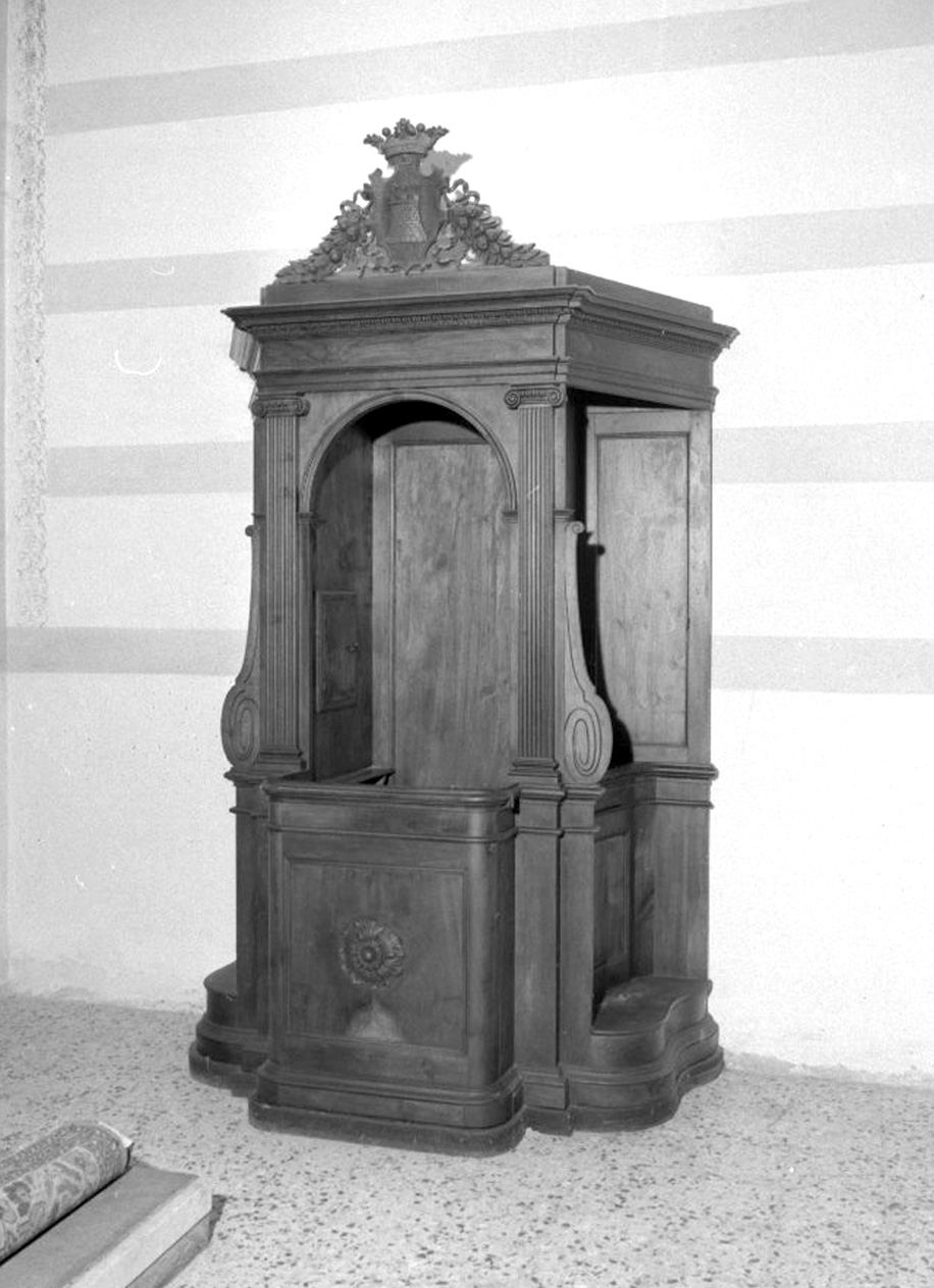 Confessionale con base poggiante su uno zoccolo sagomato. Sulla parte anteriore apribile è scolpito un rosoncino. Due paraste scanalate con capitello ionico sorreggono la trabeazione, ornata con un motivo di dentelli, ovuli e cornice aggettante. Alla sommità stemma con sei monti e tre stelle, sorretto ai lati da festoni di frutta