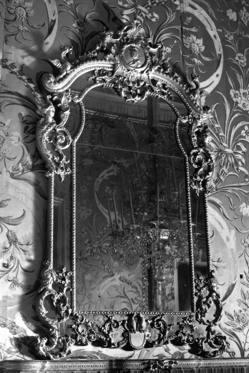 - NOTIZIE STORICO CRITICHE Specchio con cornice, la cui decorazione è caratteristicamente 'Recence', di manifattura italiana della prima metà del '700. Proviene assieme a uno specchio simile dal palazzo della Crocetta e fu ridorato nel 1855 da doratore Francesco Murnecchi per la nuova destinazione nel quartiere delle stoffe