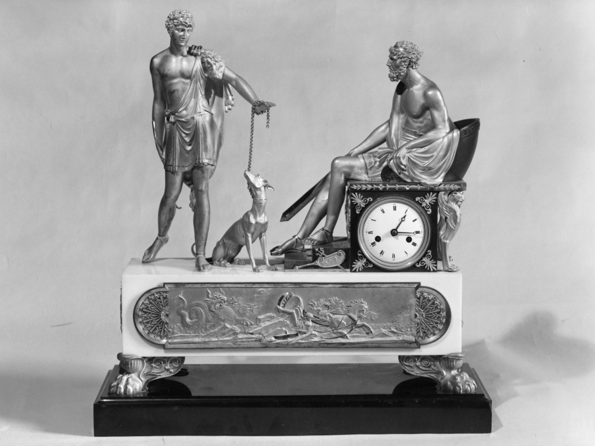 Base rettangolare di marmo bianco sorretta da piedini in bronzo dorato a zampa di leone che posano su una controbase in marmo nero. Sul davanti della base lunga "applique" di bronzo dorato e cesellato con bassorilievo raffigurante la morte di Ippolito. Sopra la base a destra la figura di Teseo in bronzo dorato seduto su un trono di bronzo patinato, con la spada nella mano destra. Il trono contiene il movimento con mostra di smalto bianco.Davanti a Teseo, a sinistra sulla base dell'orologio, vedesi la figura di Ippolito con un cane levriero ai piedi che lo osserva