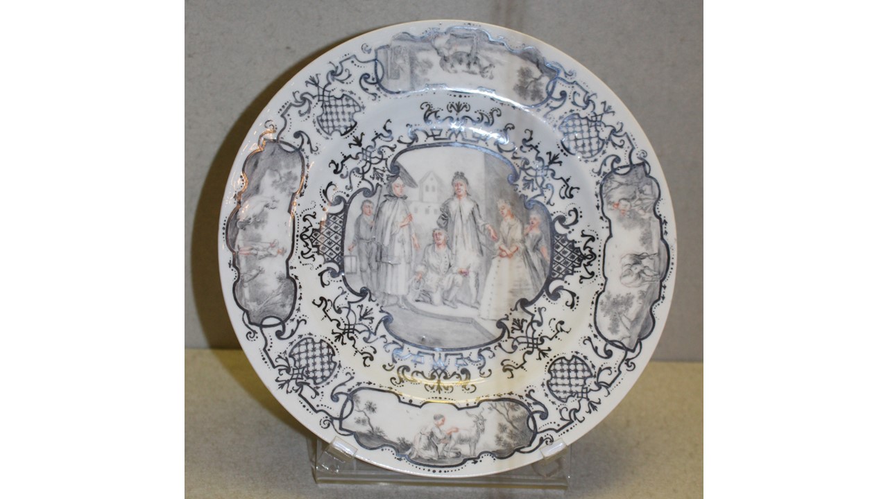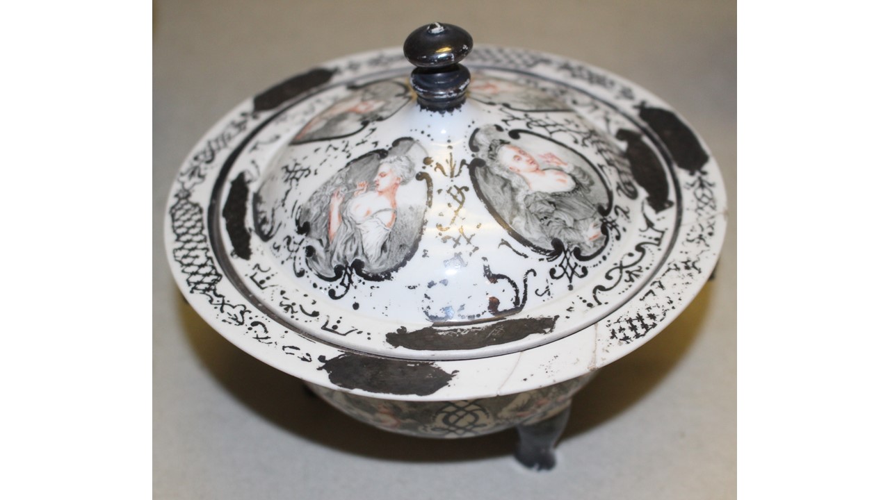 - NOTIZIE STORICO CRITICHE La superficie è decorata con scene di teatranti inserite in cartouche con cornici sagomate e motivi geometrici in argento annerito dal tempo. Sempre dipinti in argento sono i manici, i piedini e la presa del coperchio. La decorazione è riconducibile all'atelier di sabina Aufenwerth di Augusta intorno al 1730. L scena al centro del piatto deriva da una serie di sei acqueforti eseguite da François Joullain del 1726 con soggetti tratti dalle commedie di Molière. Nello specifico la scena citata riproduce "Dandin ou le mari confondu da un disegno di Charles-Antoine Coypel