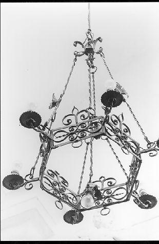 Corpo centrale composto da fascia di forma esagonale decorata da volute. Ad ogni spigolo si dipartono portalampade a forma di piattello con bordi smerlati