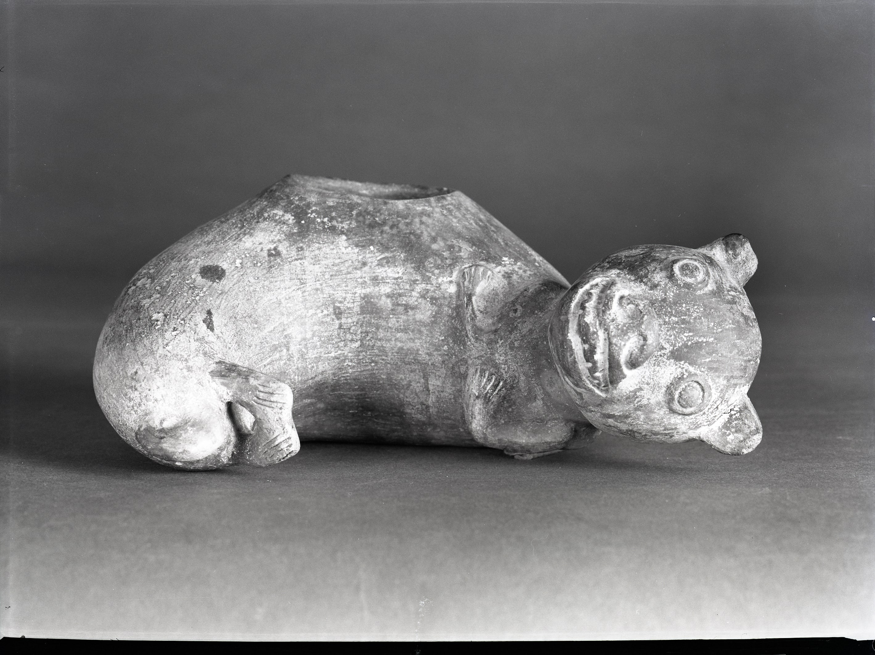 Vaso zoomorfo con funzione funeraria di colore nero tipo bucchero di forma felina con larga imboccatura sul dorso. Il felino è rappresentato sdraiato su un fianco. Macchie più chiare causate da un difetto di cottura
