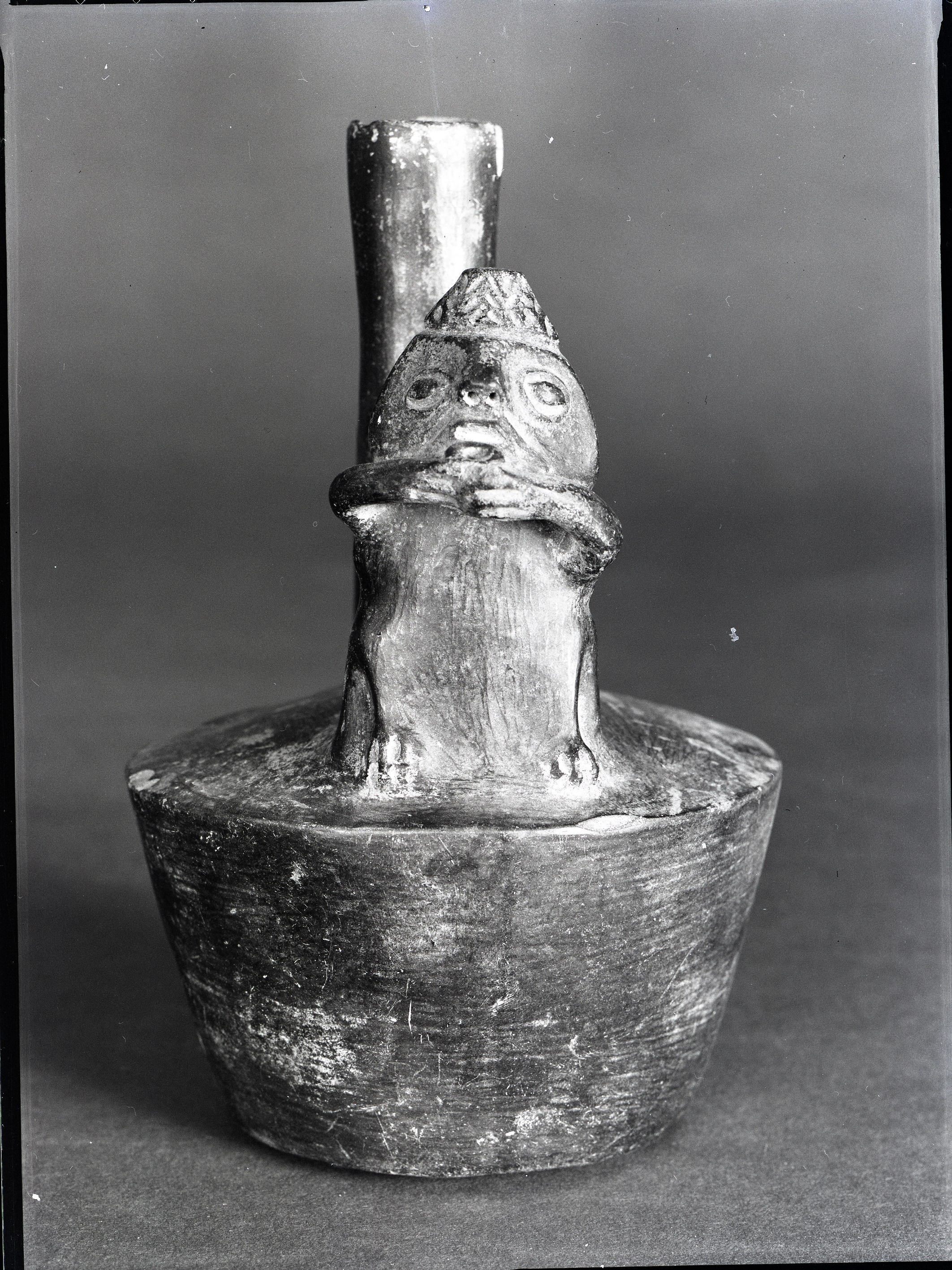 Vaso tronco-conico con funzione funeraria a base piana in terracotta nera tipo bucchero con figura antropomorfa a rilievo plastico in stato di bere e berretto troncoconico decorato con un motivo inciso. Il collo si allarga leggermente verso l'alto. Ansa a staffa