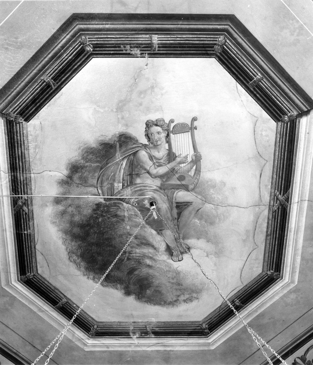 Soffitto dipinto a tempera su intonaco; al centro è un ottagono con cornice dorata legata da nastri incrociantisi e sovrapponentesi, raffigurante Apolo seduto con la cetra in mano. Intorno all'ottagono centrale sono ai quattro angoli degli esagoni allungati decorati da motivi a racemi azzurri, rossi, verdi, gialli; al centro dei quattro lati sono quattro rettangoli dipinti a monocromo rosa ancora con motivi vegetali, palmette, foglie di acanto che si arricciolano, volute affrontate. A riquadrare il tutto sono quattro triangoli a fondo blu con decorazione a monocromo grigio, con una conchiglia affiancata da riccioli