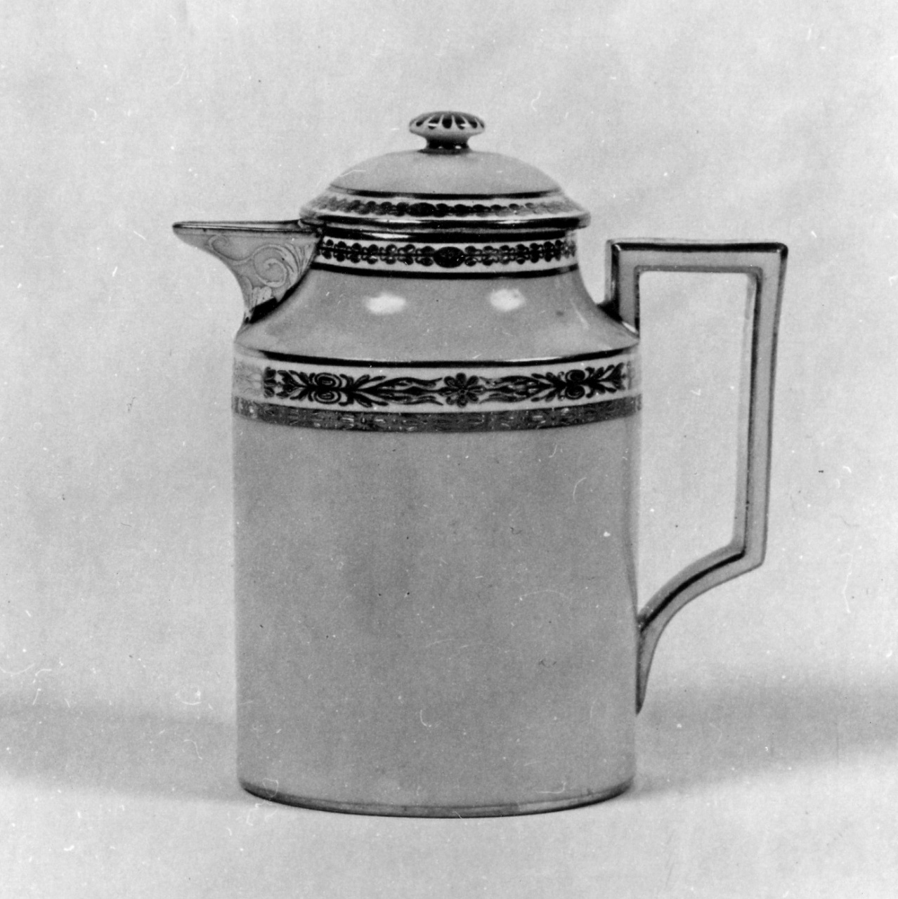 - NOTIZIE STORICO CRITICHE Caffettiera con manico bordato d'oro e coperchio staccato che ha per presa un bottone con sopra dipinto un fiore stilizzato in oro. Tre pezzi di un servizio da caffè, fondo rosa con zone bianche decorate con fregi in oro liscio e a rilievo. Il servizio si compone di una caffettiera con manico bordato d'oro e coperchio staccato che ha per presa un bottone con sopra dipinto un fiore stilizzato in oro, una lattiera in tutto simile ma più piccola, e una zuccheriera a forma di vaschetta ovale con due manici. L'uso della forma cilindrica per caffettiere e lattiere che si trova prima nelle tazze e nei piattini, risale all'ultimo quarto del Settecento e per un periodo di circa dieci anni (1800-1810) fu quella più usata alla manifattura viennese. Questo servizio originariamente comprese anche una tazza e piattino i quali furono nel 1893 e sono scomparsi