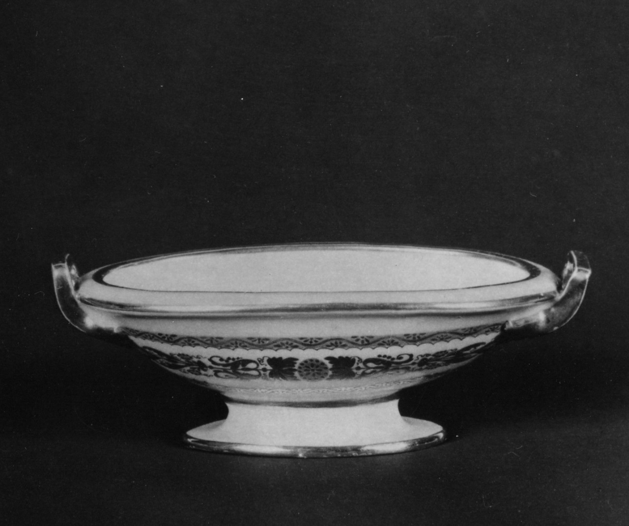 - NOTIZIE STORICO CRITICHE Servizio da caffè per due persone (tête-a-tête) con fondo giallo limone decorato con sottile fregio d'oro a piccolo rilievo su fasce fondo bianco. Nel centro dei diversi pezzi (meno la zuccheriera) una specchiatura quadrangolare ornata con un vaso e festoni stilizzati in oro. Il vassoio è profilato in oro, mentre la zuccheriera ha due manici laterali dorati. I pezzi non portano la marca di nessun pittore; ma lo stile della decorazione, simile a quello dell'inventario n. 250-4, 241-2, rassomiglia molto a quello di George Perl (attivo 1771-1806). Benché no risulti negli inventari del periodo, la zuccheriera originaria fu rotta e sostituita dalla manifattura di Doccia prima del 1840. La tazza fu ideata alla Manifattura di Sèvres nel 1754, dove veniva denominata “gobelet Bouillard”. Venne realizzata nella fabbrica viennese dal 1792. La zuccheriera è un rimpiazzo eseguito prima del 1840 dalla Manifattura Ginori, come rivelato dalla marca della stessa: stellina in oro