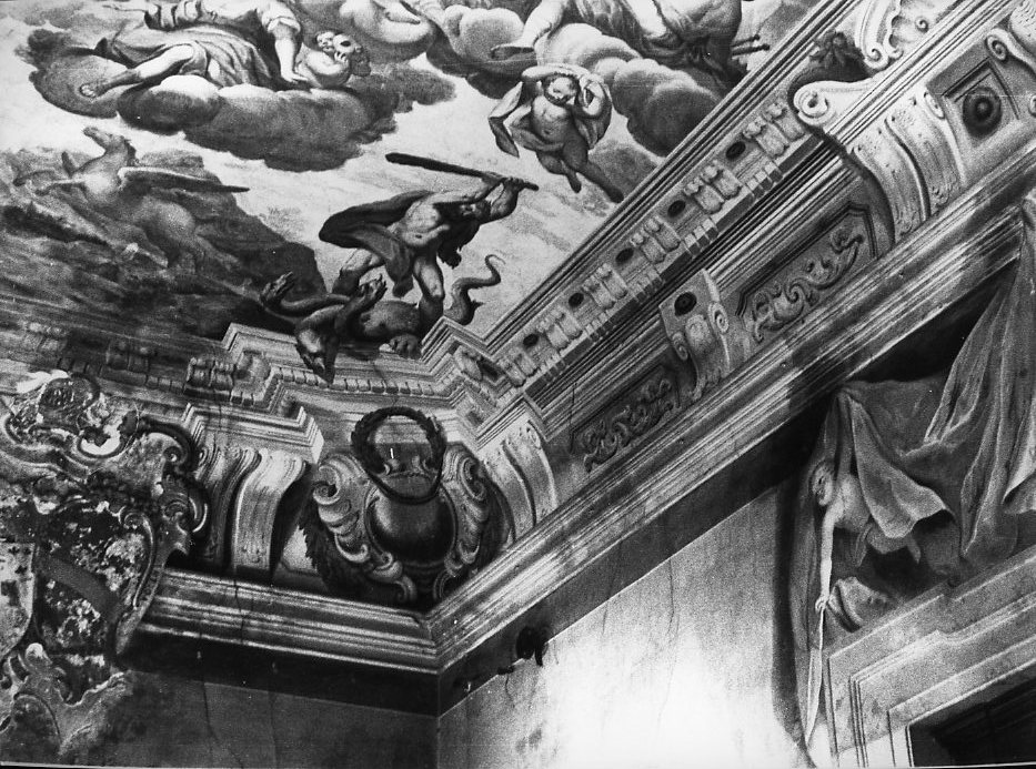 La volta del vano d'ingresso al salone presenta, all'interno di una fascia di architettura dipinta, una decorazione rappresentante muse, putti e divinità dell'Olimpo. Nella parte più bassa del dipinto, Ercole sulla terra lotta contro il drago, sul fondo scolpito, vi è Pegaso il cavallo alato. Nel cielo sono collocate figure di putti volanti e suonatori con al centro, seduto su una nuvoletta, Apollo con la sua lira in mano. La parte superiore della parete contenente la porta che immette nel salone è decorata con drappi sostenuti da tre angeli, nei tenui toni del rosa e del bianco. Tonalità pastello, più biaccose, caratterizzano invece i colori della volta in cui è raffigurata l'invenzione della musica