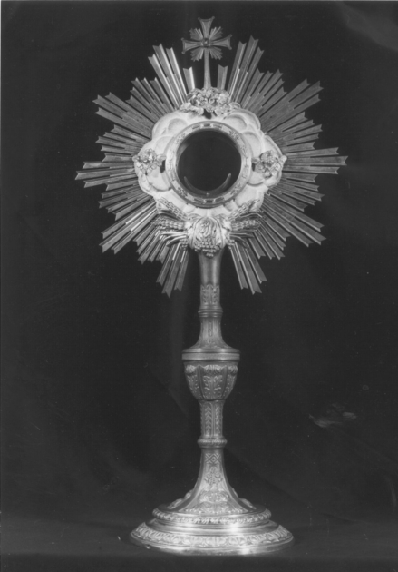 Piede a base circolare su due cornici a palmette e a nastro includente perline,corpo interno tripartito con infiorescenze di foglie d'acanto. Fusto con nodoa vaso con rigidi motivi fogliacei. Mostra su fascio di spighe legate da grappolid'uva con raggiera irregolare, nuvole e cherubini, teca circolare, crocettaapicale con bracci rastremati. La doratura è parziale