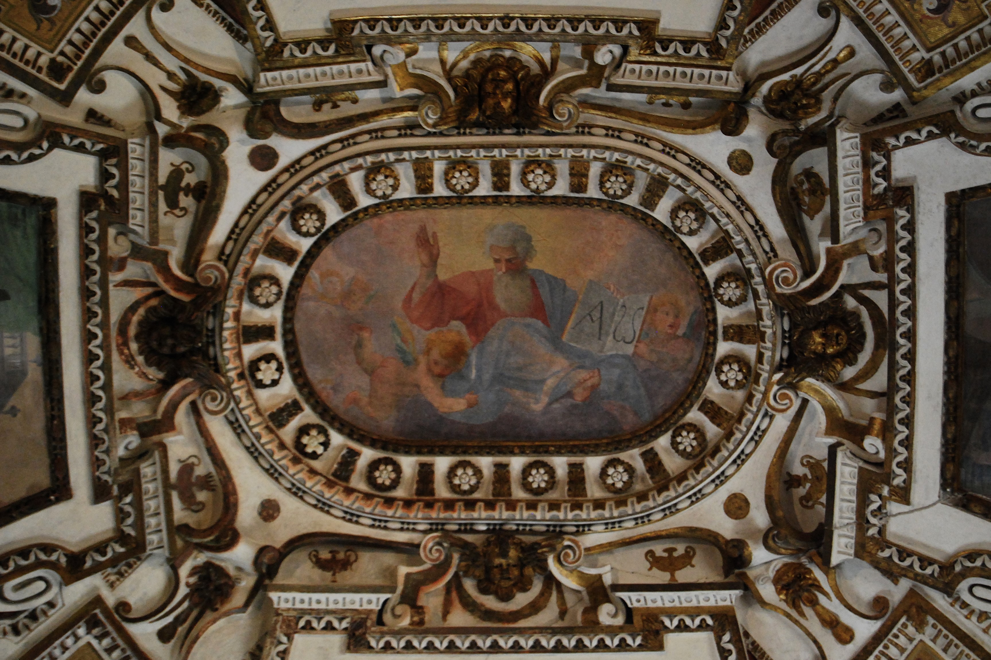 L’affresco si trova al centro della volta, racchiuso in un ovale, raffigurante Dio padre benedicente tra angeli, che sorregge il libro con Alfa e Omega. La cornice in stucco è caratterizzata da fioroni intervallati da foglie di acanto