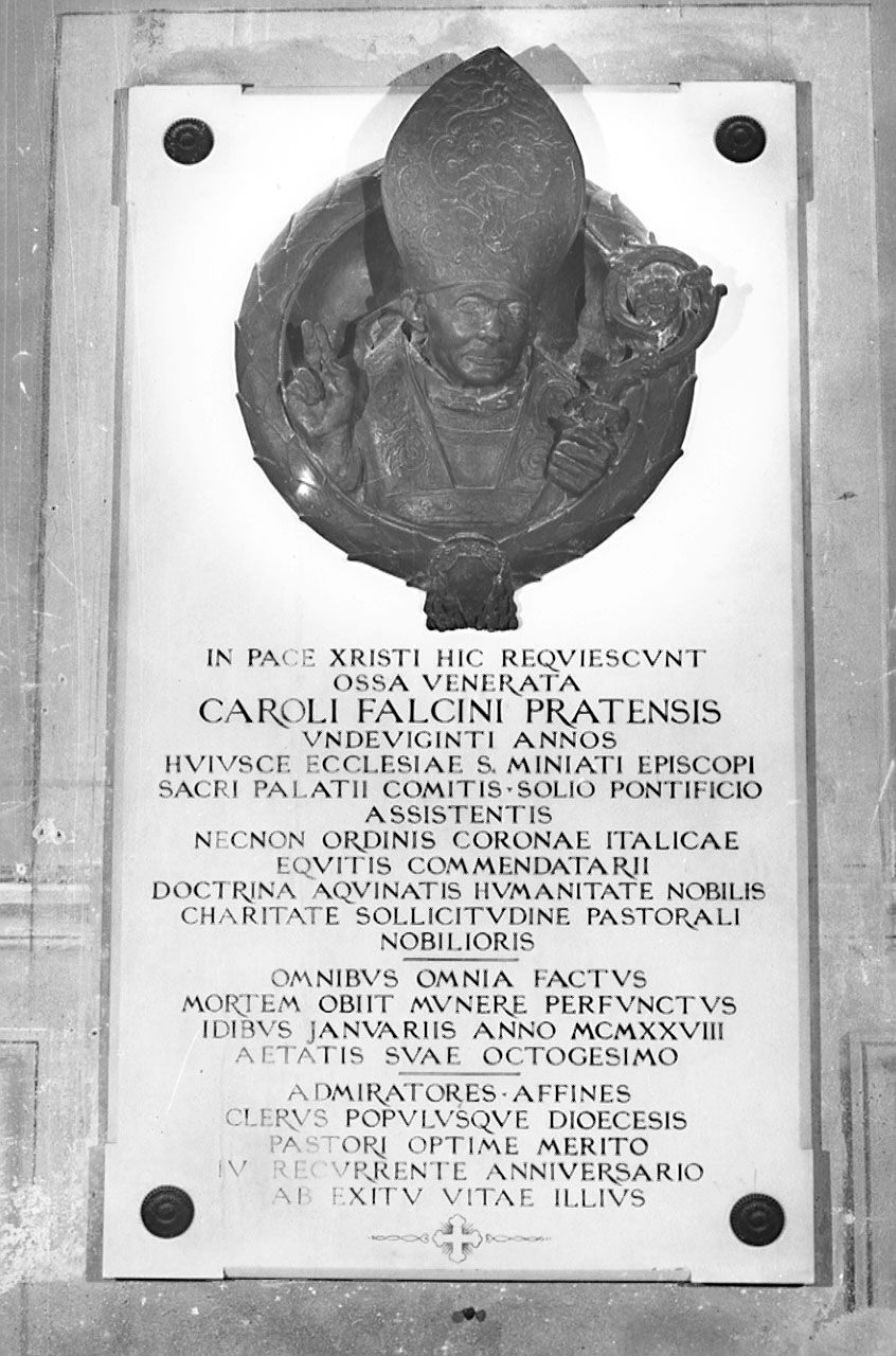 Corpo rettangolare con quattro borchie angolari, nella parte superiore medaglione concavo ornato da corona d'alloro includente il busto ritratto del defunto con mitra e pastorale, in basso al centro piccola croce trilobata raggiata. Iscrizione con lettere annerite a piombo