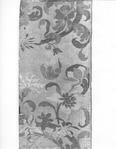 Frammento rettangolare a fondo senape e disegno in sete policrome. Da un tralcio ondulante verticale con foglie, originano rametti di fresie, garofani, tulipani aperti e in boccio, anemoni. Ancorato a un supporto rigido rivestito in tela