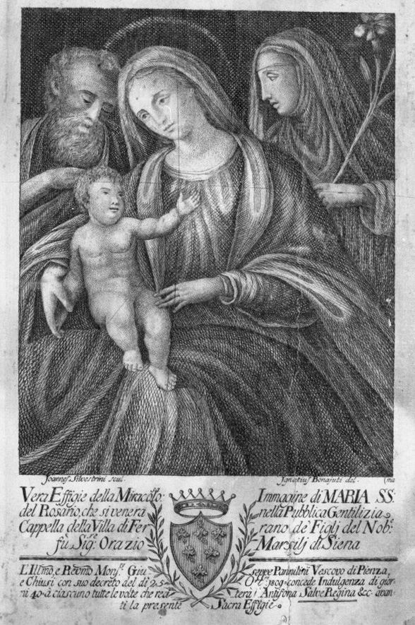 - ISCRIZIONI in basso al centro - Vera effigie della miracolosa immagine di Maria Santissima / del rosario c he si venera nella pubblica gentilizia / Cappella della Villa di Ferrano d e' figli del nobile fu signore Orazio Marsili di Siena / Illustrissimo Rev erendissimo Mons(ignore) Giuseppe Pannilini Vescovo di Pienza / e Chiusi c on suo decreto del 25 ottobre 1809 concede indulgenza di giorni 40 a ciasc uno tutte le volte che reciterà l'antifona Salve Regina ecc(---) avanti la presente sacra effigie - corsivo -