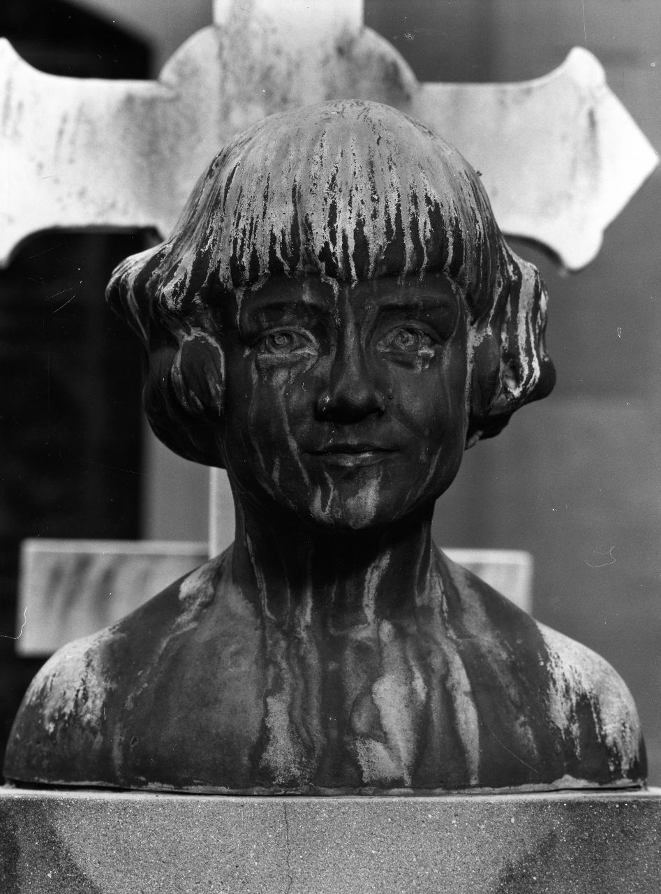 su una lapide con l'iscrizione si alza un esile basamento in pietra che sostiene la scultura