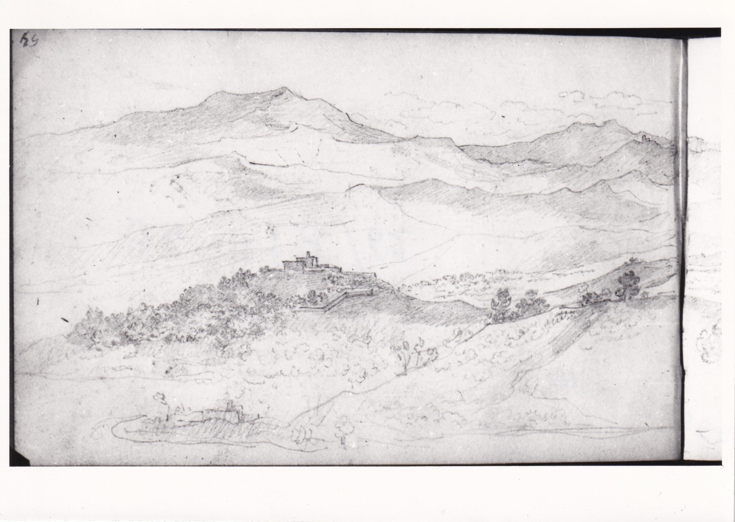 Il disegno è tracciato in senso inverso rispetto ai disegni contenuti nel medesimo taccuino. Sul recto si completa la veduta tracciata sul foglio n. 2343/53 v. Sul verso schizzo sommario che riproduce le linee essenziali di un monumento rinascimentale, il coronamento del quale è disegnato sul foglio n. 2343/55 r