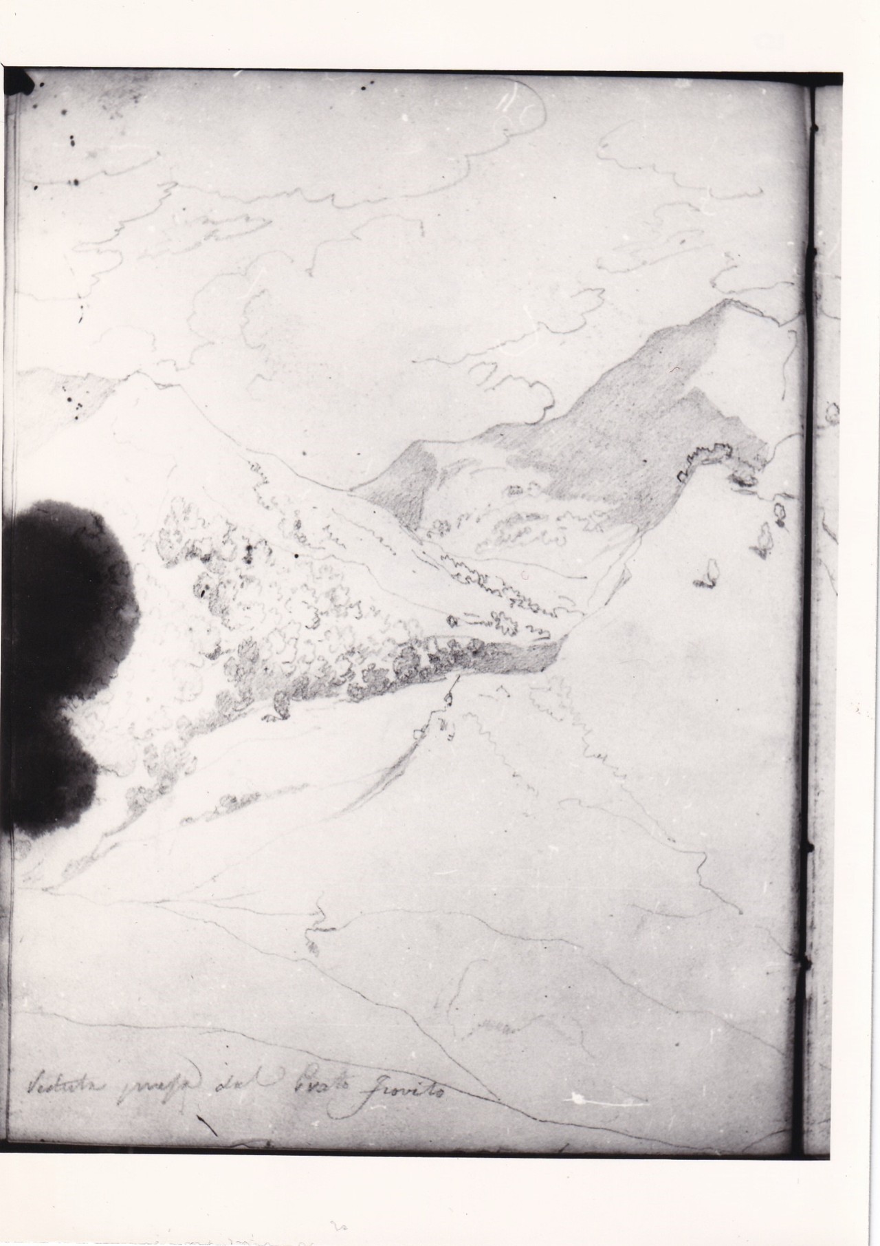 - NOTIZIE STORICO CRITICHE Recto: Splendido disegno fra i più intensi di tutto il taccuino, in cui sono particolarmente evidenti le qualità cromatiche peculiari del disegno di paesaggio del Bezzuoli. Il tenerissimo chiaroscuro degli alberi, delle rive del fiume, la straordinaria invenzione del taglio d'ombra lungo le pendici montuose, i riflessi dolci sull'acqua del fiume accentuano emotivamente una condotta disegnativa fondata su la palpitante ressa degli effetti cromatici e luminosi del paesaggio. Il risultato di grandissimo interesse, anche per la data molto precoce che, come si è detto nella scheda n. 2344/1-33 dovrebbe cadere intorno al 1818