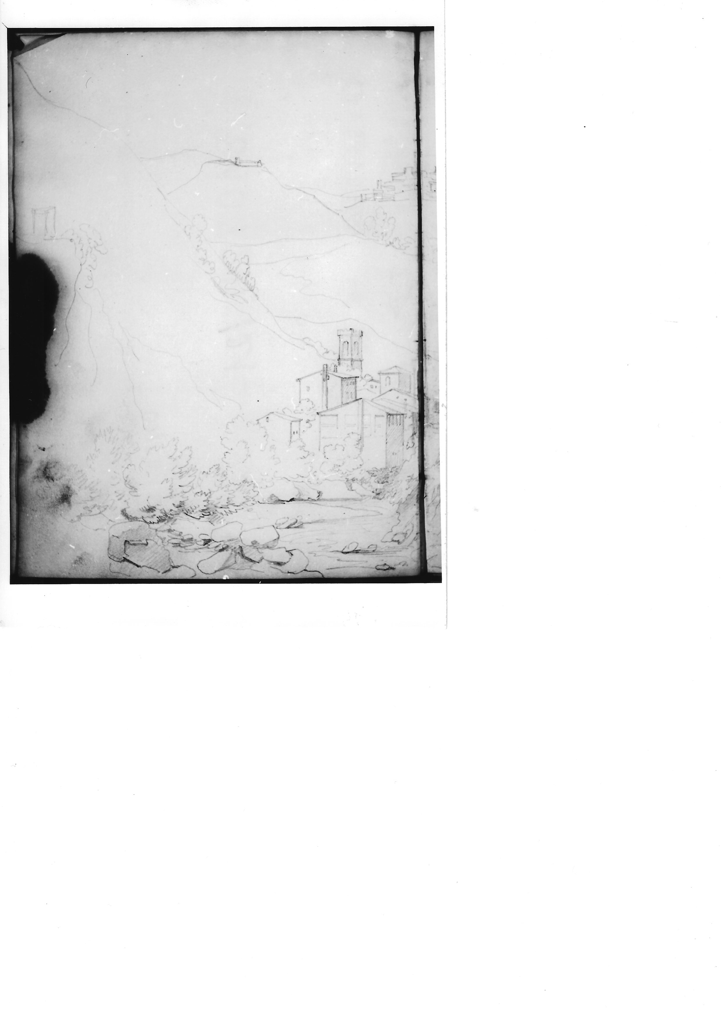 RECTO- Abbozzo molto sommario forse interpretabile come veduta con una montagna scura sullo sfondo. VERSO- Parte della veduta di vallata del foglio n. 2344/12 recto (vedi scheda)