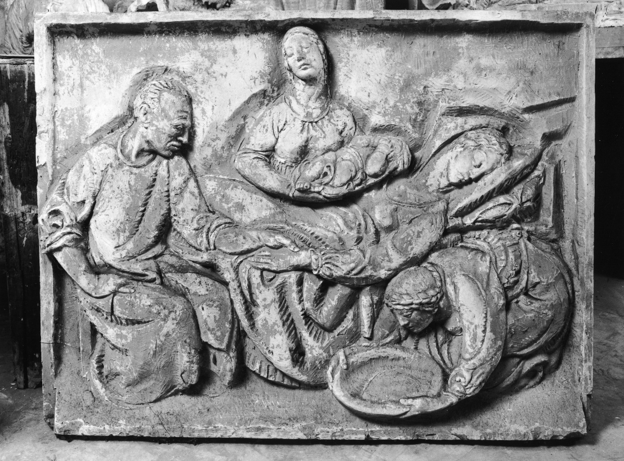 - NOTIZIE STORICO CRITICHE La targa in memoria del professore Giuseppe Resinelli, ginecologo fiorentino morto nel 1915 (raffigurato nell'uomo in camice che assiste la partoriente), fu commissionata ad Andreotti dal rettore dell'Università di Firenze, Giulio Chiarugi, tramite Ojetti ed eseguita entro il 1916 (Pizzorusso/ Lucchesi, 1997). Fu pubblicata nel 1916 da Giovanni Costetti su "La Tempra", nello stesso articolo in cui egli presentava il ritratto della marchesa Niccolini, riconoscendovi il recupero del punto di contatto perduto "fra la grande arte nostra passata e la presente" (Cultura europea, 2000). Il rilievo piacque a Ojetti, che nell'articolo dedicato ad Andreotti su "Dedalo" nel 1920 ne lodò la semplicità e la chiarezza, la "capacità di composizione e d'espressione", vedendolo come paradigmatico delle proprie teorie neo-tradizionaliste. Lodò anche il "ricordo ghirlandajesco" della fantesca col catino, "perché rivela che questo scultore non teme gli antichi"; e infatti nella Targa ricordi da Jacopo della Quercia e da Nicola Pisano si mescolano al "cézannismo marcato che ricostruiva il volume" (Cultura europea, 2000).La Gipsoteca ne conserva un secondo esemplare (Gipsoteca Libero, 1992); la traduzione in marmo si trovava alla Clinica di Maternità, già in via degli Alfani a Firenze