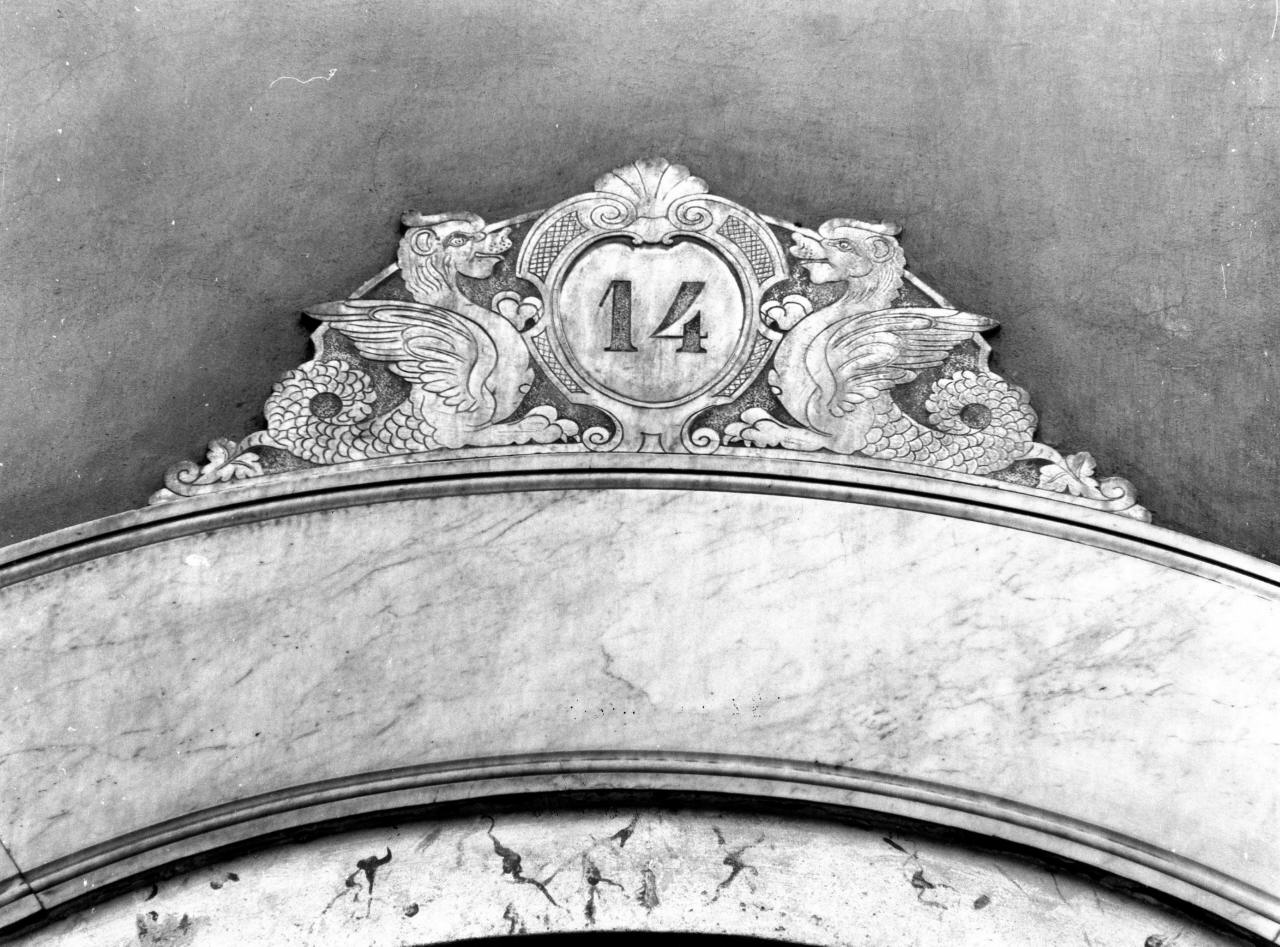 - NOTIZIE STORICO CRITICHE Quest'elegante cornice di porta in marmo dovette essere eseguita nella seconda metà del XIX secolo. A questa data farebbero risalire la tipologia delle teste e i due grifi contrapposti che sorreggono il numero civico 14. Secondo una comunicazione orale dell'attuale proprietario la profilatura in esame già esistente agli inizi del XX secolo