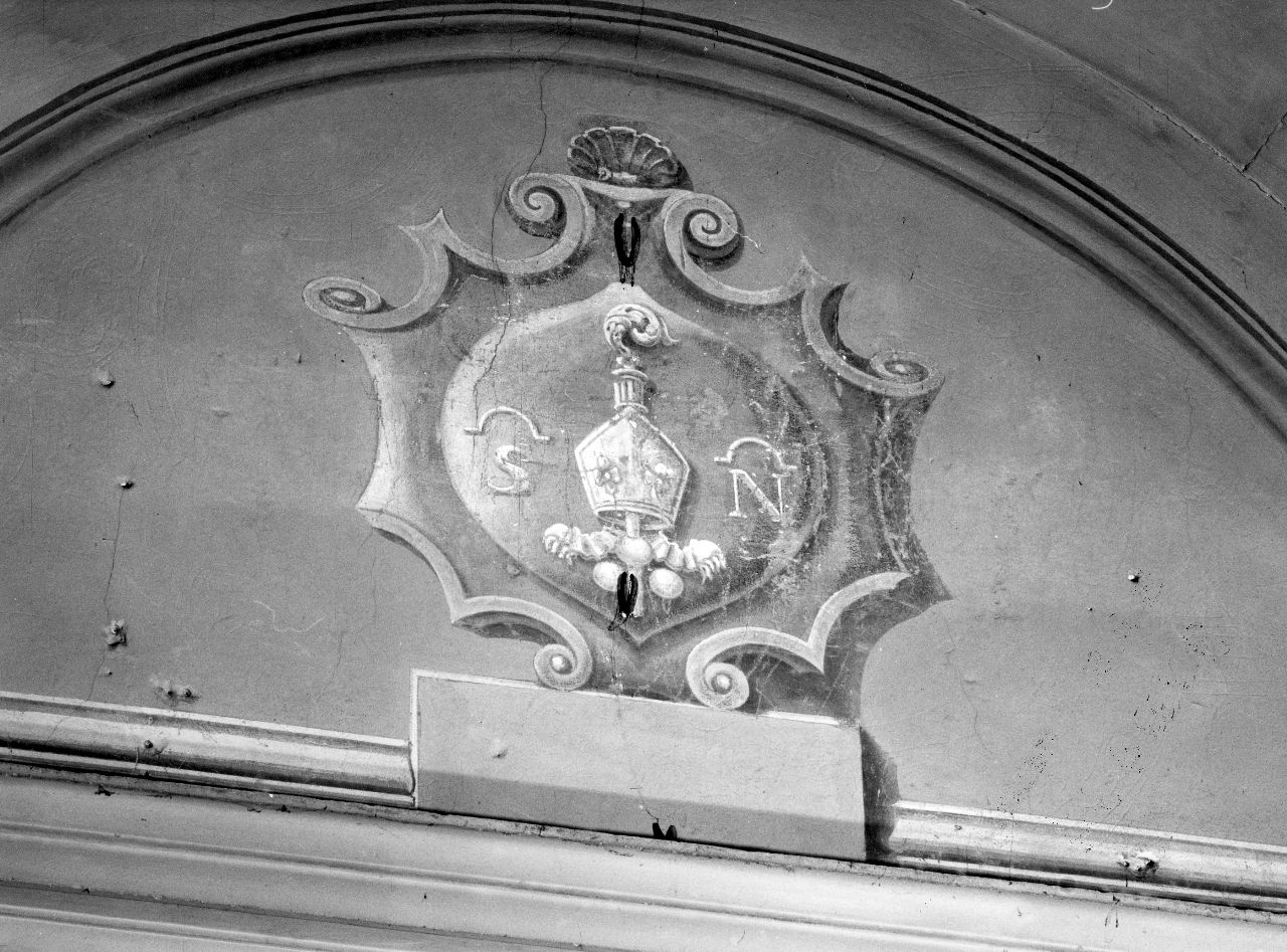 - NOTIZIE STORICO CRITICHE Il 21 maggio 1610 anno in cui fu sistemata la parete di fondo dietro la nuova tela che il Curradi stava dipingendo fu pagato il Maestro Nicodemo Ferruzzi pittore per la pittura fatta della facciata de l'altare di nostra Compagnia (ACSN Entrata e Uscita). Potrebbe trattarsi dello stemma in questione, databile, per il tipo di scudo a cartocci, al primo Seicento. Il Ferrucci lavorò in altra occasione per la confraternita, ed infatti il 13 maggio 1613 fu pagato per haver dipinto la facciata sopra deschi, ma in questo caso si tratta di un'opera perduta nei rimaneggiamenti ottocenteschi della controfacciata