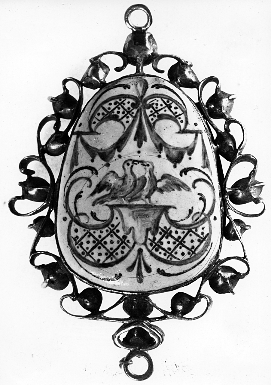 Cornice a castone pieno in argento dorato con due maglie circolari saldate alle estremità verticali. Intorno sono incastonati a notte otto granati e nove diamanti; il verso è smaltato con fondo bianco sul quale sono dipinte in porpora e grigio fregi e due colombe