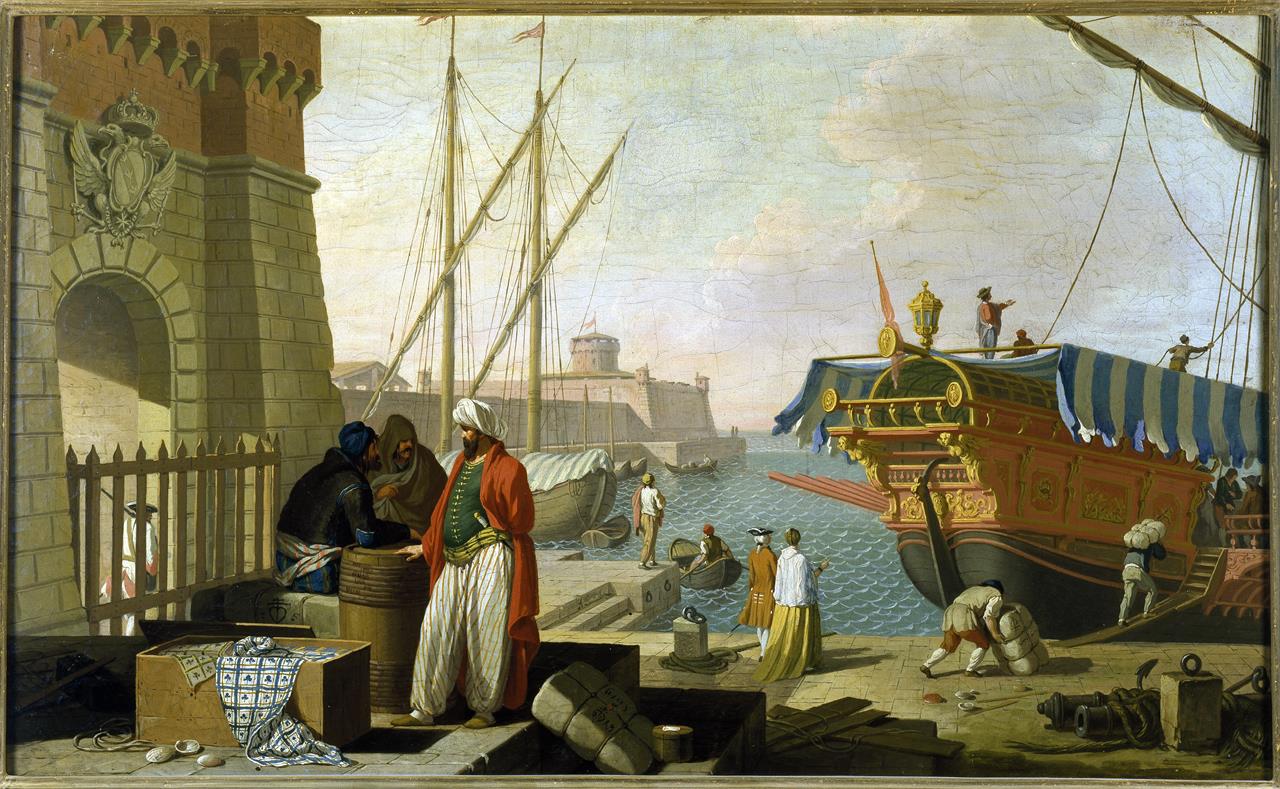Pittoresca rievocazione del porto di Livorno: a sinistra un bastione della darsena, alla cui ombra un gruppo di tre persone vestite nella foggia turchesca contratta affari. A terra, drappi orientali e il caratteristico motivo decorativo delle conchiglie. Si dilunga poi al centro il molo con le grandi strutture granducali, cui si attracca un veliero. Sulla destra alcuni marinai caricano merci su un galeone fermo in darsena: una coppia azzimata osserva la scena