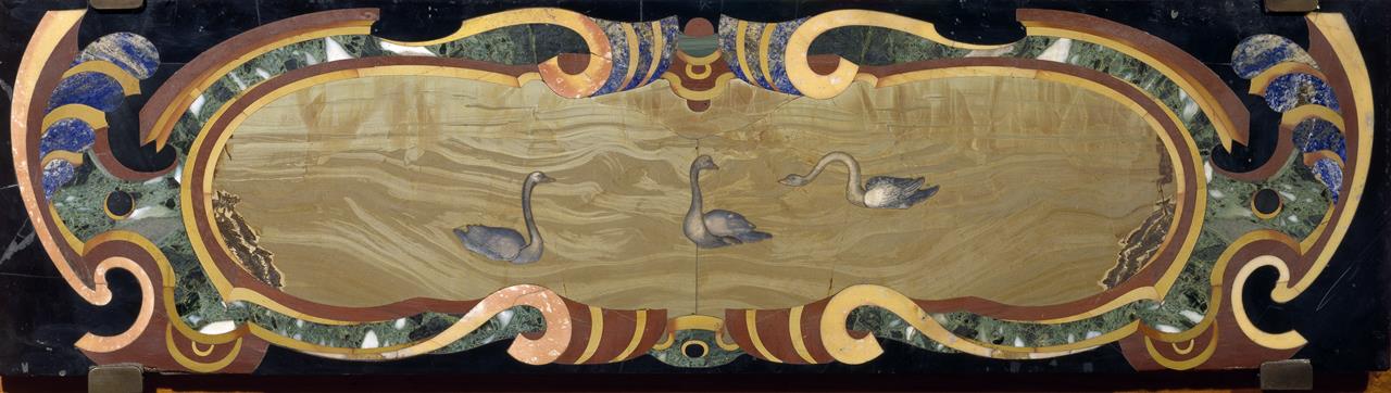 • NOTIZIE STORICO CRITICHE Questo cartiglio, che inserisce entro la lastra di lineato dell’Arno i cigni eseguiti in calcedonio, ha il suo pendant in una analoga opera, sempre conservata presso l’Opificio, che presenta stessa tecnica e misure, differenziandosi solo per il soggetto con animali marini. La critica, tenendo conto dello stile del cartiglio, specifico delle fertile fantasia post-buontalentiana, ritiene possa trattarsi di una produzione nata in rapporto con la decorazione della Cappella dei Principi. In seguito alle modifiche e traversie del progetto originale, i due pezzi sarebbero stati recuperati come semplice quadretto di genere