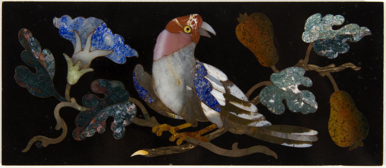 Questa formella rettangolare presenta, su un fondo di marmo nero, un ornato eseguito a commesso di pietre dure, raffigurante, in posizione centrale un uccello che volge la testina all’indietro, alla sua destra due pere, alla sua sinistra un grande fiore espanso ornato da viticci e foglie
