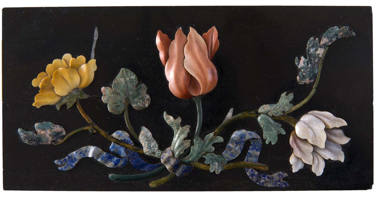 Formella rettangolare, eseguita in commesso di pietre dure a bassorilievo, su fondo di marmo nero. Presenta una libera composizione floreale, di taglio orizzontale, in cui, in un serto strettamente intrecciato, è visibile al centro, svettante un espanso tulipano: sui due lati esterni, decorati dalla presenza di foglie sinuose, altri due fiori con ricca corolla. Al centro un nastro che serra il piccolo mazzo, serpentinato come un cartiglio