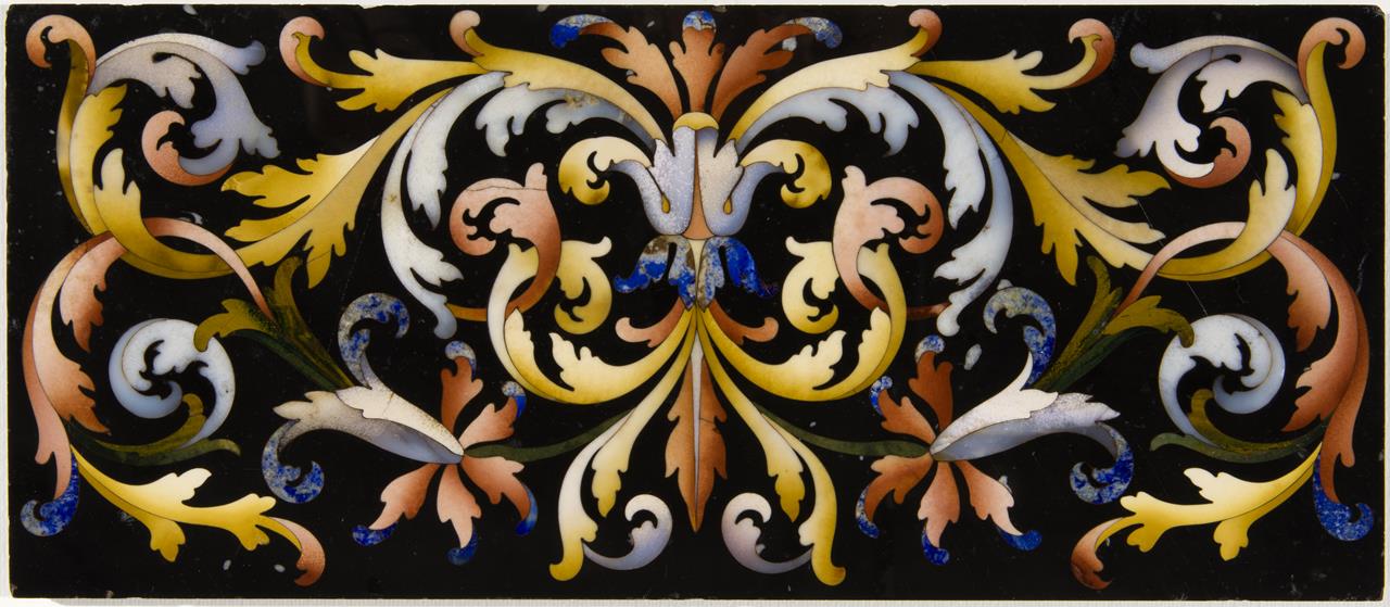 Semplicissima composizione in commesso di pietre dure che, su fondo di marmo nero, presenta un elegante gioco di cartigli e racemi eseguito in lapislazzuli, calcedonio di Volterra e diaspri, seguendo un disegno di carattere meramente esornativo