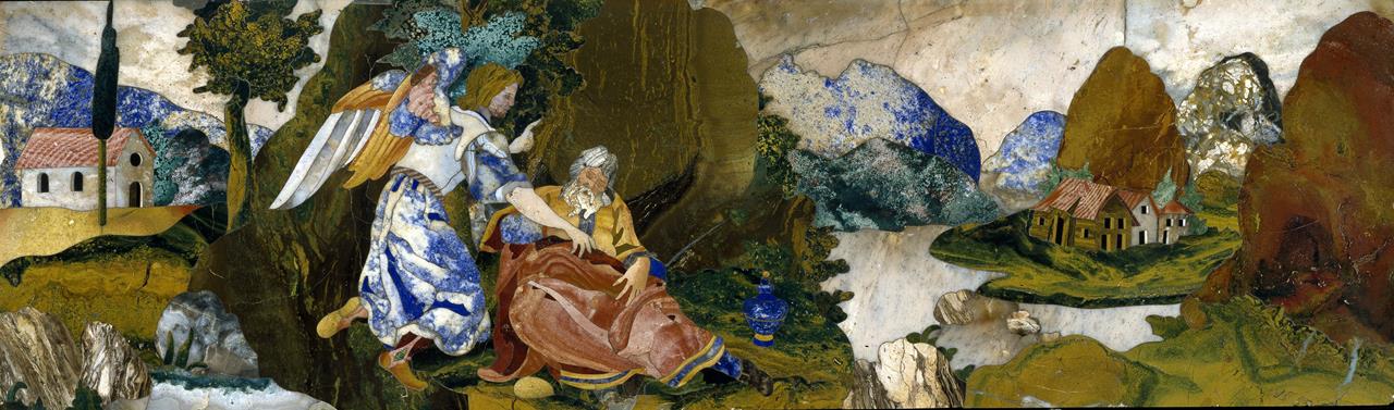 - NOTIZIE STORICO CRITICHE La formella fa parte di una piccola serie di tre storiette, prossime per il soggetto biblico e l’impiego dei materiali, in prevalenza diaspri, calcedoni e lapislazzuli, che sembra rinviare, per l’impianto disegnativo ed il genere trattato alla pittura fiorentina dei primi due decenni del secolo XVII, ed in particolare all’ambiente dominato dall’influenza del Cigoli. Nella piccola serie le formelle più simili sono questa in esame ed il commesso raffigurante “Sansone e il leone”, soprattutto per l’ampio spazio accordato al paesaggio e per la vivacità cromatica delle pietre dure usate. Tutte e tre le formelle furono riutilizzate in età leopoldina, insieme ad una ultima formella con “Giona e la balena” come decorazione per l’altare eretto dopo il 1760 nella Cappella della Villa del Poggio Imperiale, ma, dopo il disfacimento di detto altare, avvenuto nel 1820, tutte le formelle tornarono all’Opificio