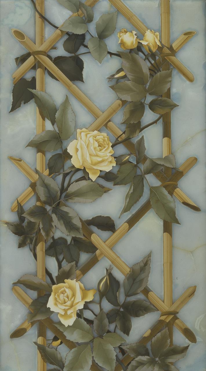 Commesso di pietre dure eseguito in diaspri di Volterra e dell’Arno su fondo di alabastro orientale. Su un graticcio di canne si intreccia un rigoglioso tralcio di rose gialle e boccioli decorato da un esuberante fogliame