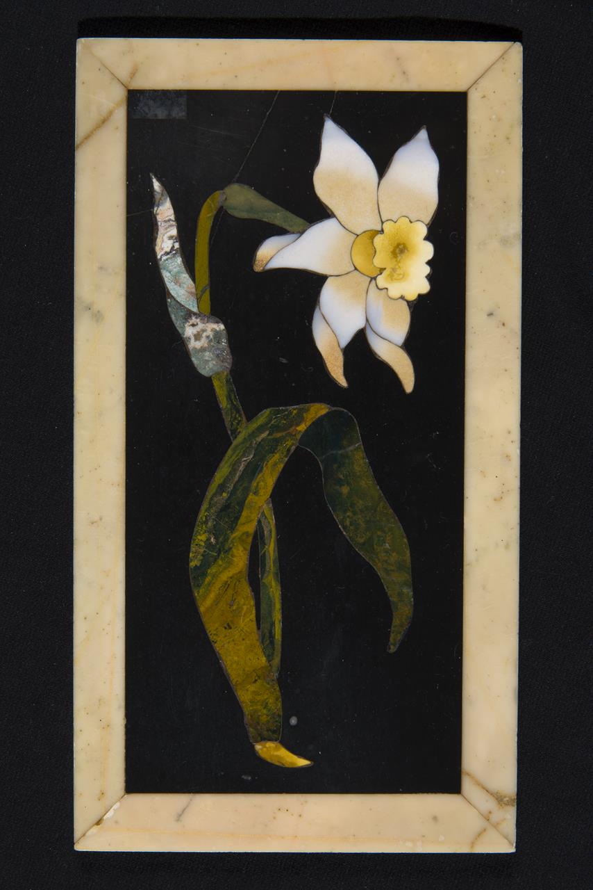 Formella in commesso di pietre dure su fondo di marmo nero e incorniciatura di marmo giallo antico. I materiali alternano pietre dure – calcedoni, diaspri di Volterra e di Boemia- con “marmi antichi”. La decorazione presenta un unico fiore, ornato da lunghe foglie lanceolate