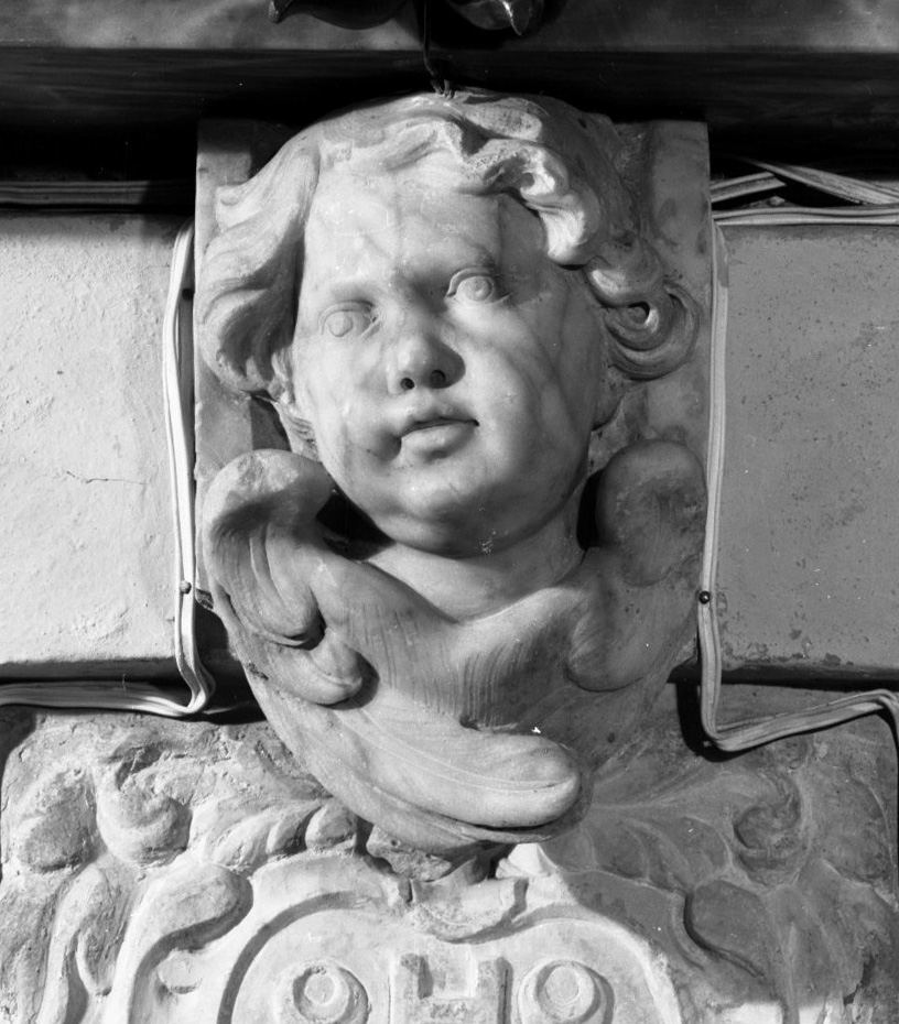- NOTIZIE STORICO CRITICHE La testina è senz'altro da legare ai due angeli reggicandelabro, in mezzo ai quali si trova murata. Probabilmente da considerare tra quegli "angeli dell'altare maggiore...disegnati con tutta la smorfia dell'epoca" che il Romagnoli attribuisce allo scultore e intagliatore senese Pietro Montini