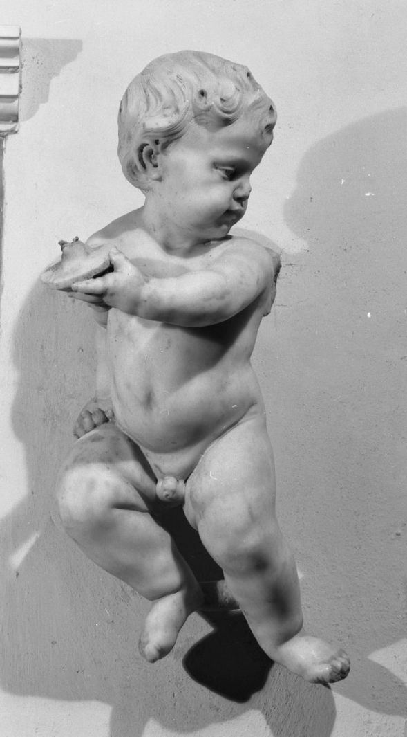 Piccola scultura raffigurante un angelo, rappresentato come un putto, che sostiene una base circolare, evidentemente il resto di una torciera, con la mano sinistra. Mancano alcune dita della mano destra e le ali. La posizione del corpo è piuttosto articolata; la testa rivolta in alto a sinistra. Si trova murato sulla parete sinistra del retro dell'altare maggiore