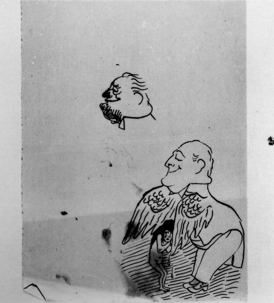 Figure: uomo in frac con ali d'uccello; figura femminile nuda; testa d'uomo