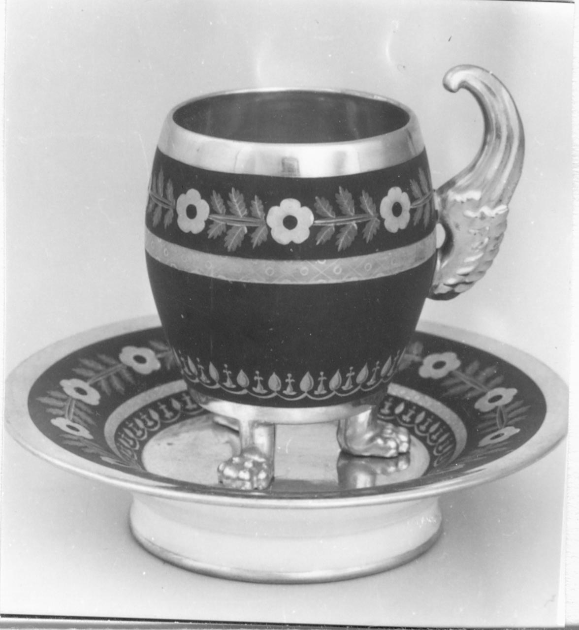 - NOTIZIE STORICO CRITICHE Questo modello di tazza ricorda un esemplare attribuito a una manifattura della Turingia, conservato al Musée National de la Ceramique di Sèvres. Anche il motivo decorativo, con decorazioni in oro fu fondo ocra opaco, manico e bordi dorati, della nostra tazza con relativo piattino è abbastanza simile. Probabilmente apparteneva a Ferdinando III di Toscana