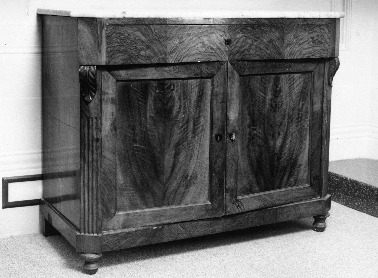 Una credenza di noce con due sportelli, un cassetto e piano di marmo. Ha i piedi torniti e scannellature agli angoli