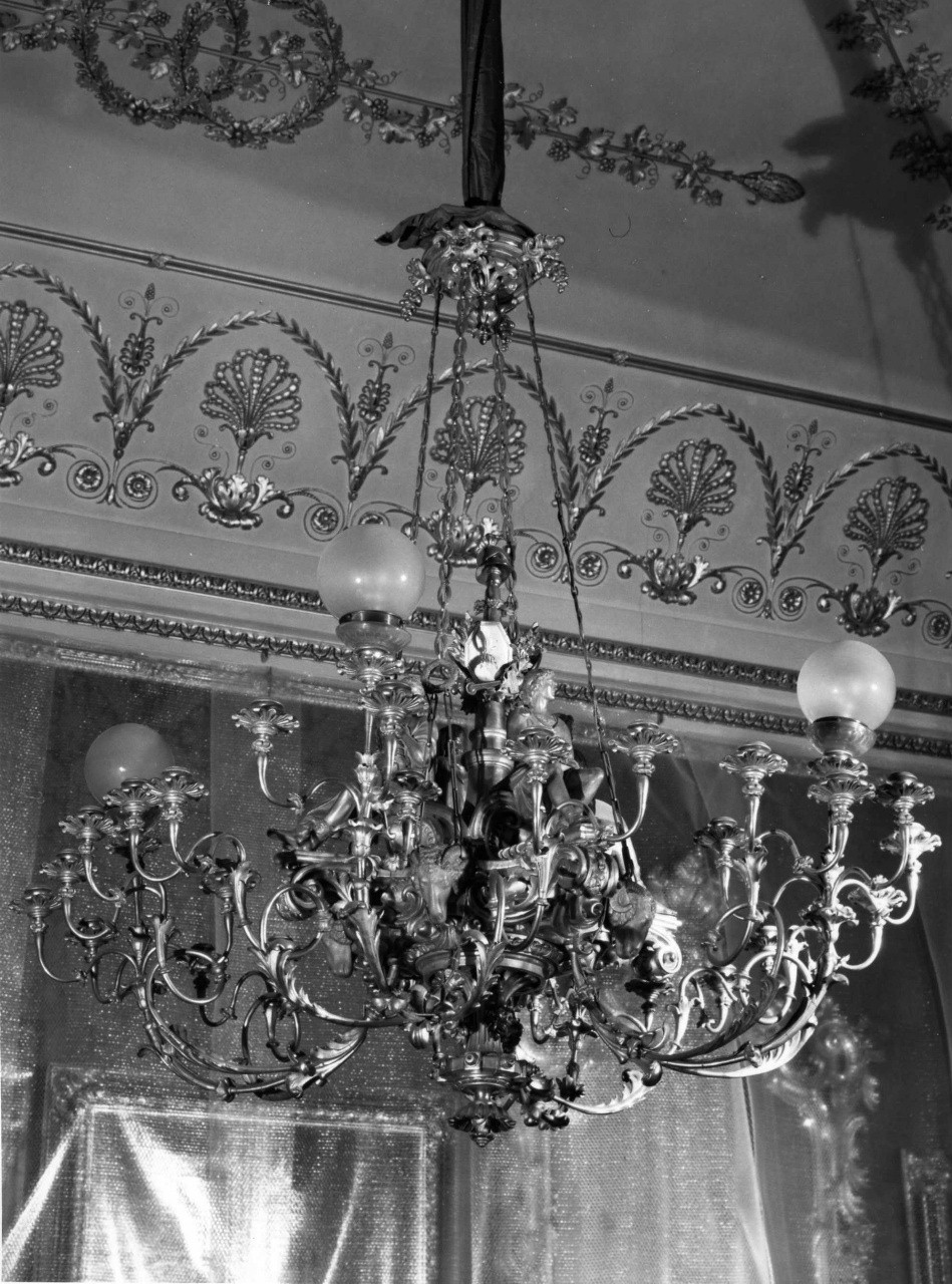 - NOTIZIE STORICO CRITICHE dal 1872 questo lampadario si trova nel 'Salotto Rosso' dell'Appartamento del Re nel cosiddetto 'Quartiere delle Stoffe'. E' proprio a partire da questa data che i rimandi inventariali risultano errati per una confusione operata da colui che redasse l'inventario. Si può solo supporre, quindi, che questa lumiera sia stata eseguita intorno alla metà dell'Ottocento da qualche bronzista fiorentino forse in occasione dei restauri che proprio durante gli anni cinquanta si andavano eseguendo in alcuni quartieri del palazzo. D'altronde lo stile 'eclettico' del lampadario, in parte 'neosettecentesco' nei bracci e in parte 'Impero' negli intagli centrali, non può essere precedente agli anni quaranta