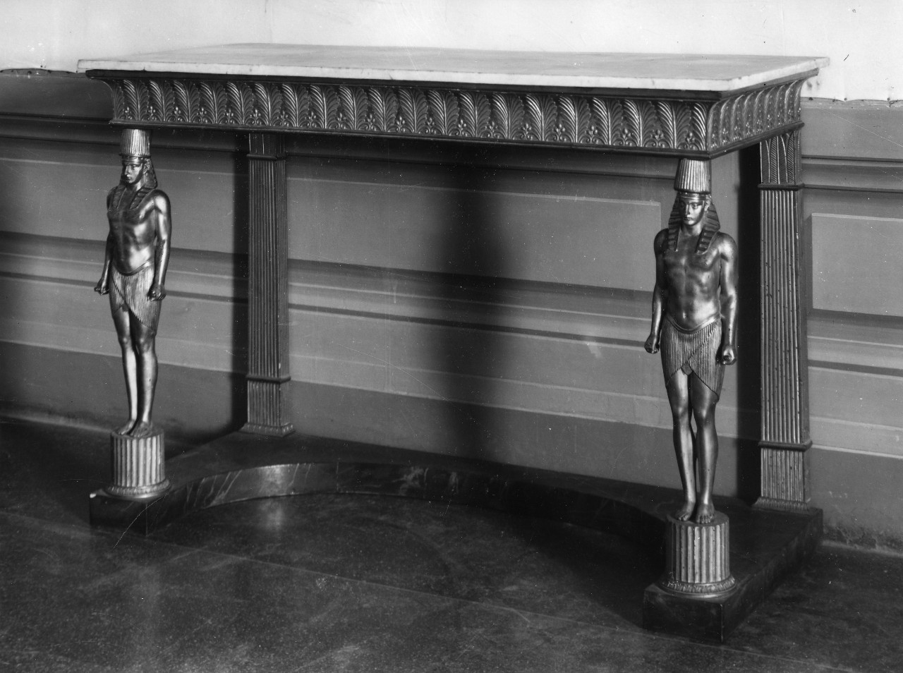 - NOTIZIE STORICO CRITICHE La consolle entra a far parte degli arredi di Palazzo Pitti il 3 marzo 1865 proveniente da Lucca con Mandato n. 428 (Guardaroba Giuseppe Piccardi). Il Morazzoni le attribuisce a Giovanni Socci "regnando Elisa Baciocchi"; attribuzione successivamente contrastata dal Gonzales Palacios il quale asserisce che figure egizie sostenenti mensole erano assai diffuse nel repertorio decorativo dei palazzi granducali e quindi potrebbero essere opera di un anonimo mobiliere dei primi decenni dell'Ottocento