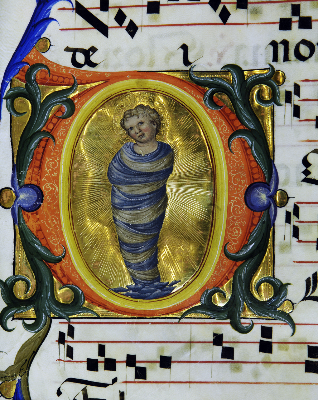 Iniziale fogliata media con figura e caudata D(ominus dixit ad me), rubr. In nativitate domino nostri Jhesu Christi. In prima missa. Introitus. Corpo della lettera arancione decorato con foglie azzurre e verdi che vanno a formare la coda. Sul fondo in foglia d'oro è la figura intera di Gesù Bambino che poggia su alcune nuvolette ed è avvolto nelle fasce bianche e azzurre; egli è circondato da una mandorla di raggi di luce incisi sulla foglia d'oro