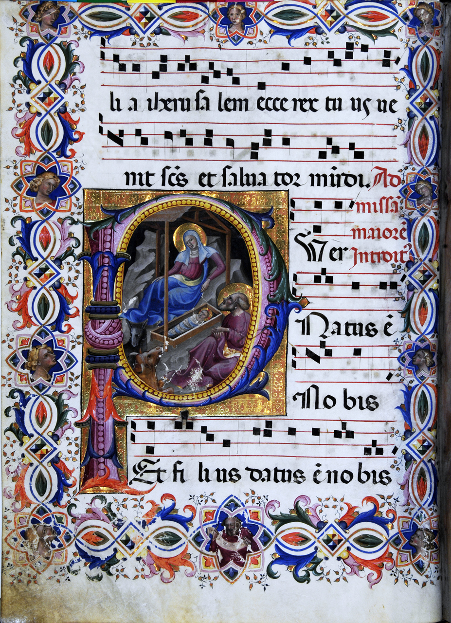 Iniziale fogliata grande con storia e fregio sui quattro margini P(uer natus est), rubr. Ad missam maiorem. Introitus. Corpo della lettera rosa decorato con cornici perlate annodate, anelli e foglie verdi, azzurre e arancioni. Il fregio è separato e realizzato secondo un'impostazione geometrica in cui si alternano losanghe diamantate, foglie e dieci cornici polilobate con dentro testine rivolte verso la scena principale e una figura di Profeta a mezzobusto con il cartiglio srotolato. Sul fondo della lettera è la scena della Natività ambientata in un paesaggio roccioso: in primo piano sono Giuseppe, seduto e con la testa rivolta verso la Vergine, il bue e l'asino. In secondo piano e la capanna lignea sotto la quale sono il piccolo Gesù avvolto in fasce dentro la mangiatoria e la Vergine distesa appoggiata al braccio